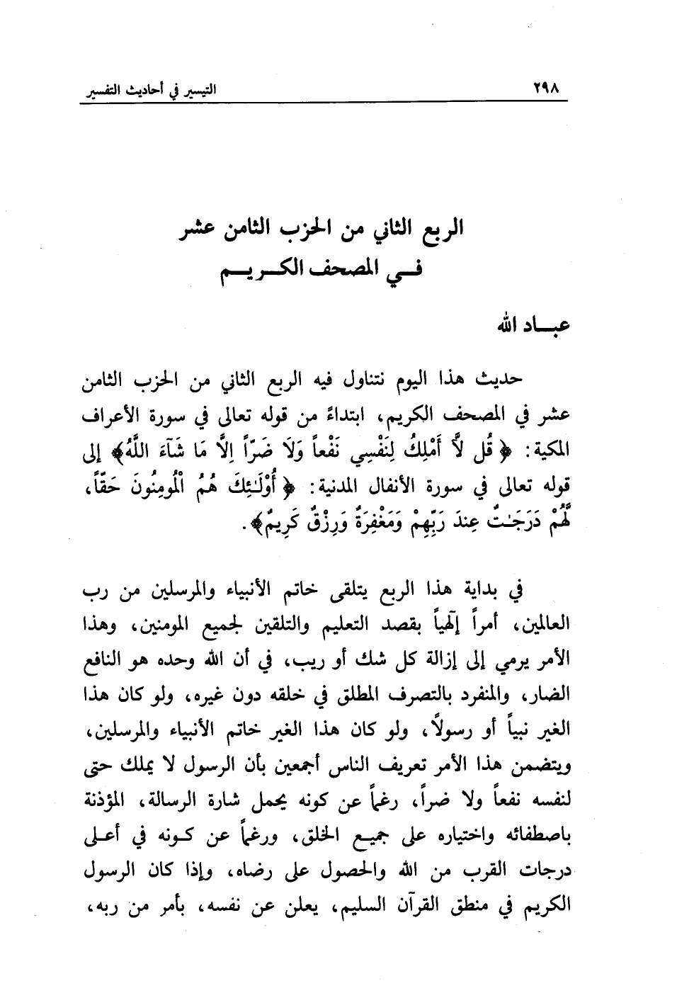 حديث هذا اليوم نتناول فيه الربع الثاني من الحزب الثامن عشر في المصحف الكريم، ابتداء من قوله تعالى في سورة الأعراف المكية: {قُلْ لَا أَمْلِكُ لِنَفْسِي نَفْعًا وَلَا ضَرًّا إِلَّا مَا شَاءَ اللَّهُ} إلى قوله تعالى في سورة الأنفال المدنية: {أُولَئِكَ هُمُ الْمُؤْمِنُونَ حَقًّا لَهُمْ دَرَجَاتٌ عِنْدَ رَبِّهِمْ وَمَغْفِرَةٌ وَرِزْقٌ كَرِيمٌ}.