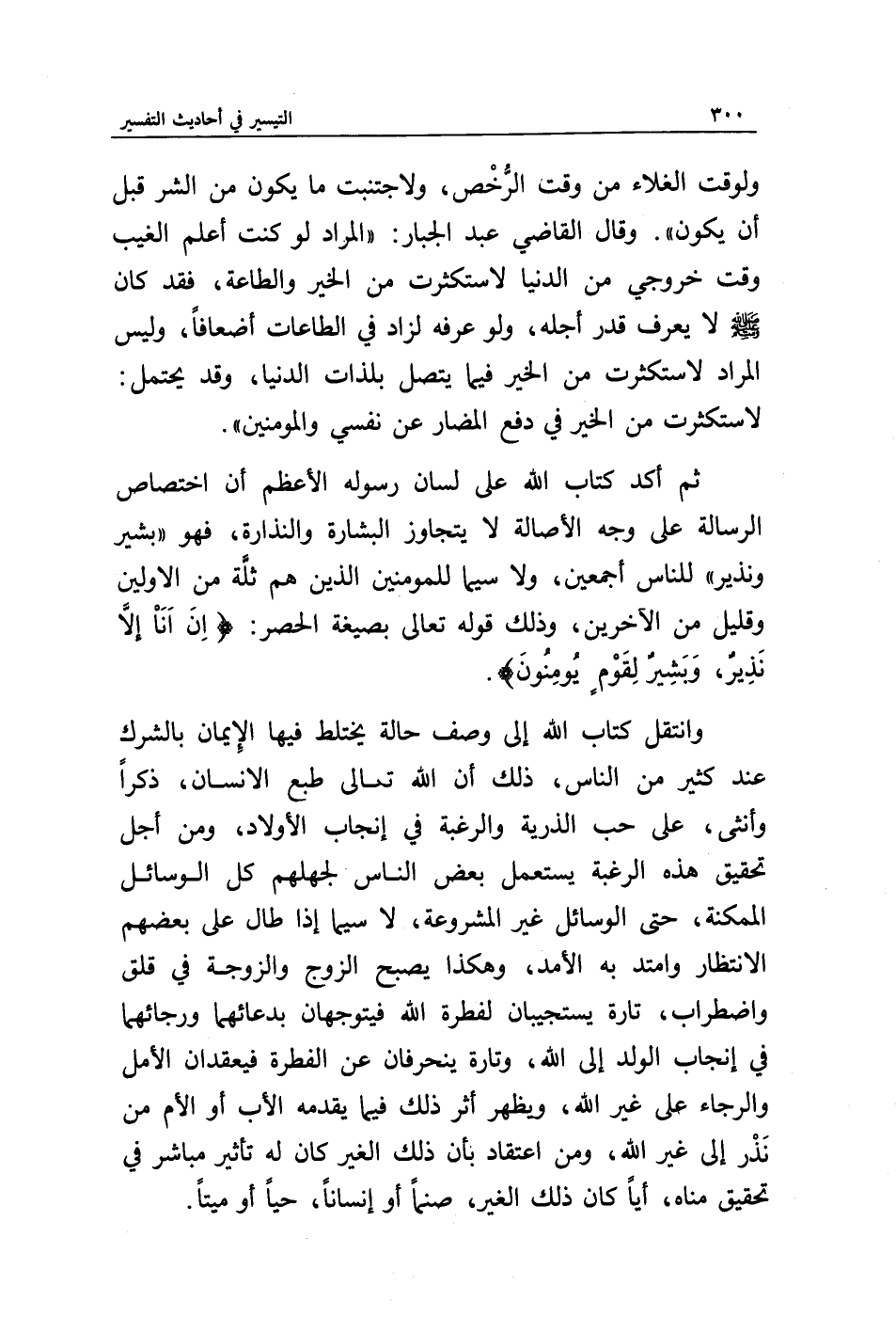 ثم أكد كتاب الله على لسان رسوله الأعظم صلى الله عليه وسلم أن اختصاص الرسالة على وجه الأصالة لا يتجاوز البشارة والنذارة، فهو " بشير ونذير " للناس أجمعين، ولاسيما للمؤمنين الذين هم ثلة من الأولين وقليل من الآخرين، وذلك قوله تعالى بصيغة الحصر: {إِنْ أَنَا إِلَّا نَذِيرٌ وَبَشِيرٌ لِقَوْمٍ يُؤْمِنُونَ}.