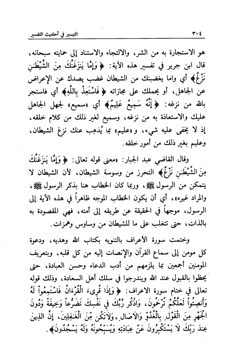 وقال القاضي عبد الجبار: " معنى قوله تعالى: {وَإِمَّا يَنْزَغَنَّكَ مِنَ الشَّيْطَانِ نَزْغٌ} التحرز من وسوسة الشيطان، لأن الشيطان لا يتمكن من الرسول صلى الله عليه وسلم، وربما كان الخطاب هنا بذكر الرسول صلى الله عليه وسلم والمراد غيره "، أي أن يكون الخطاب الموجه ظاهرا في هذه الآية إلى الرسول صلى الله عليه وسلم، موجها في الحقيقة عن طريقه إلى أمته، فهي المقصودة به بالذات، حتى تتغلب على ما للشيطان من وساوس وهمزات.