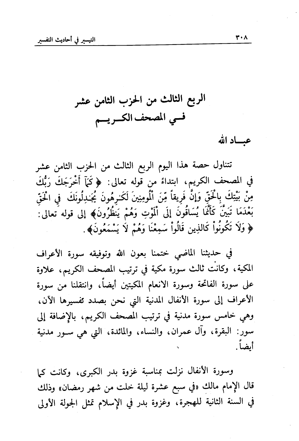 تتناول حصة هذا اليوم الربع الثالث من الحزب الثامن عشر في المصحف الكريم، ابتداء من قوله تعالى: {كَمَا أَخْرَجَكَ رَبُّكَ مِنْ بَيْتِكَ بِالْحَقِّ وَإِنَّ فَرِيقًا مِنَ الْمُؤْمِنِينَ لَكَارِهُونَ * يُجَادِلُونَكَ فِي الْحَقِّ بَعْدَمَا تَبَيَّنَ كَأَنَّمَا يُسَاقُونَ إِلَى الْمَوْتِ وَهُمْ يَنْظُرُونَ} إلى قوله تعالى: {وَلَا تَكُونُوا كَالَّذِينَ قَالُوا سَمِعْنَا وَهُمْ لَا يَسْمَعُونَ}.