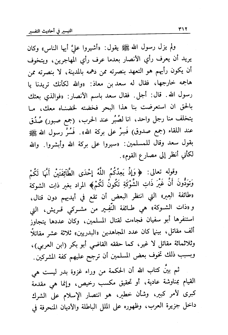 وقوله تعالى: {وَإِذْ يَعِدُكُمُ اللَّهُ إِحْدَى الطَّائِفَتَيْنِ أَنَّهَا لَكُمْ وَتَوَدُّونَ أَنَّ غَيْرَ ذَاتِ الشَّوْكَةِ تَكُونُ لَكُمْ} المراد بغير ذات الشوكة " طائفة العير " التي انتظر البعض أن تقع في أيديهم دون قتال، " وذات الشوكة " هي طائفة النفير من مشركي قريش، التي استنفرها أبو سفيان فجاءت لقتال المسلمين، وكان عددها يتجاوز ألف مقاتل، بينما كان عدد المجاهدين " البدريين " ثلاثة عشر مقاتلا وثلاثمائة مقاتل لا غير، كما حققه القاضي أبو بكر " ابن العربي "، وبسبب ذلك تخوف بعض المسلمين أن ترجح عليهم كفة المشركين.