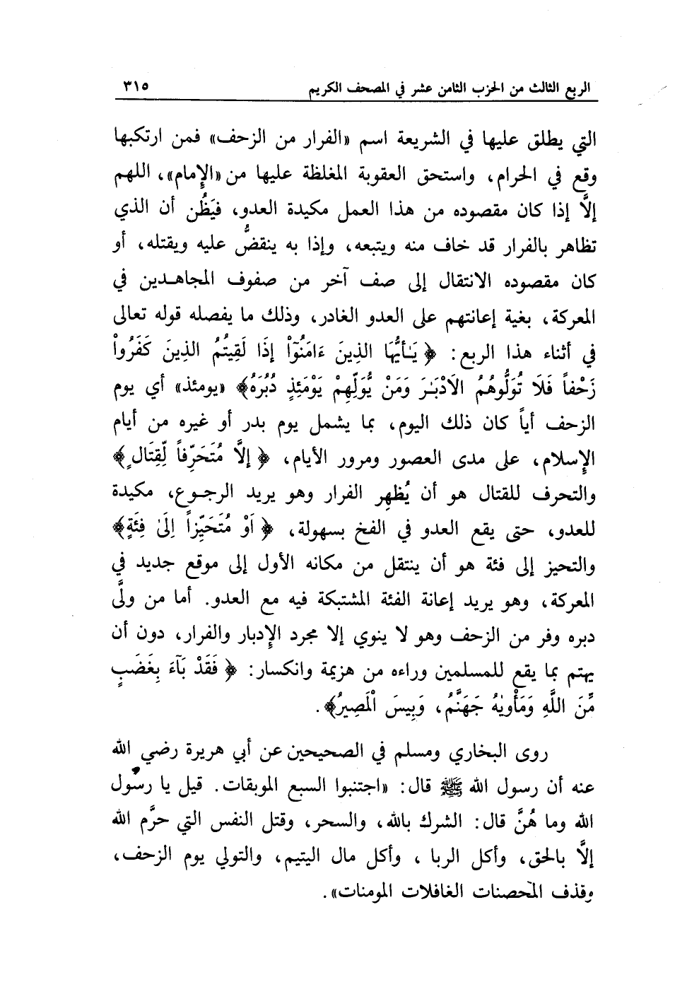 التي يطلق عليها في الشريعة اسم " الفرار من الزحف " فمن ارتكبها وقع في الحرام، واستحق العقوبة المغلظة عليها من " الإمام "، اللهم إلا إذا كان مقصوده من هذا العمل مكيدة العدو، فيظن أن الذي تظاهر بالفرار قد خاف منه ويتبعه، وإذا به ينقض عليه ويقتله، أو كان مقصوده الانتقال إلى صف آخر من صفوف المجاهدين في المعركة، بغية إعانتهم على العدو الغادر، وذلك ما يفصله قوله تعالى في أثناء هذا الربع: {يَا أَيُّهَا الَّذِينَ آمَنُوا إِذَا لَقِيتُمُ الَّذِينَ كَفَرُوا زَحْفًا فَلَا تُوَلُّوهُمُ الْأَدْبَارَ * وَمَنْ يُوَلِّهِمْ يَوْمَئِذٍ دُبُرَهُ} {يَوْمَئِذٍ} أي يوم الزحف أيا كان ذلك اليوم، بما يشمل يوم بدر أو غيره من أيام الإسلام، على مدى العصور ومرور الأيام، {إِلَّا مُتَحَرِّفًا لِقِتَالٍ} والتحرف للقتال هو أن يظهر الفرار وهو يريد الرجوع، مكيدة للعدو، حتى يقع العدو في الفخ بسهولة، {أَوْ مُتَحَيِّزًا إِلَى فِئَةٍ} والتحيز إلى فئة هو أن ينتقل من مكانه الأول إلى موقع جديد في المعركة، وهو يريد إعانة الفئة المشتبكة فيه مع العدو. أما من ولى دبره وفر من الزحف وهو لا ينوي إلا مجرد الإدبار والفرار، دون أن يهتم بما يقع للمسلمين وراءه من هزيمة وانكسار: {فَقَدْ بَاءَ بِغَضَبٍ مِنَ اللَّهِ وَمَأْوَاهُ جَهَنَّمُ وَبِئْسَ الْمَصِيرُ}.