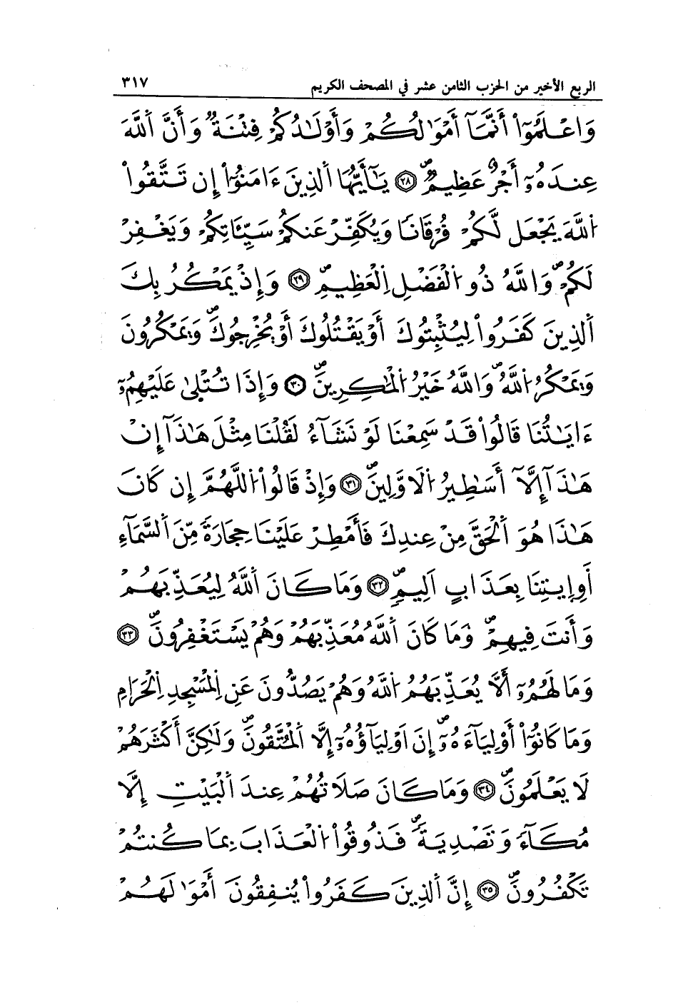 وَاعْلَمُوا أَنَّمَا أَمْوَالُكُمْ وَأَوْلَادُكُمْ فِتْنَةٌ وَأَنَّ اللَّهَ عِنْدَهُ أَجْرٌ عَظِيمٌ (28) يَا أَيُّهَا الَّذِينَ آمَنُوا إِنْ تَتَّقُوا اللَّهَ يَجْعَلْ لَكُمْ فُرْقَانًا وَيُكَفِّرْ عَنْكُمْ سَيِّئَاتِكُمْ وَيَغْفِرْ لَكُمْ وَاللَّهُ ذُو الْفَضْلِ الْعَظِيمِ (29) وَإِذْ يَمْكُرُ بِكَ الَّذِينَ كَفَرُوا لِيُثْبِتُوكَ أَوْ يَقْتُلُوكَ أَوْ يُخْرِجُوكَ وَيَمْكُرُونَ وَيَمْكُرُ اللَّهُ وَاللَّهُ خَيْرُ الْمَاكِرِينَ (30) وَإِذَا تُتْلَى عَلَيْهِمْ آيَاتُنَا قَالُوا قَدْ سَمِعْنَا لَوْ نَشَاءُ لَقُلْنَا مِثْلَ هَذَا إِنْ هَذَا إِلَّا أَسَاطِيرُ الْأَوَّلِينَ (31) وَإِذْ قَالُوا اللَّهُمَّ إِنْ كَانَ هَذَا هُوَ الْحَقَّ مِنْ عِنْدِكَ فَأَمْطِرْ عَلَيْنَا حِجَارَةً مِنَ السَّمَاءِ أَوِ ائْتِنَا بِعَذَابٍ أَلِيمٍ (32) وَمَا كَانَ اللَّهُ لِيُعَذِّبَهُمْ وَأَنْتَ فِيهِمْ وَمَا كَانَ اللَّهُ مُعَذِّبَهُمْ وَهُمْ يَسْتَغْفِرُونَ (33) وَمَا لَهُمْ أَلَّا يُعَذِّبَهُمُ اللَّهُ وَهُمْ يَصُدُّونَ عَنِ الْمَسْجِدِ الْحَرَامِ وَمَا كَانُوا أَوْلِيَاءَهُ إِنْ أَوْلِيَاؤُهُ إِلَّا الْمُتَّقُونَ وَلَكِنَّ أَكْثَرَهُمْ لَا يَعْلَمُونَ (34) وَمَا كَانَ صَلَاتُهُمْ عِنْدَ الْبَيْتِ إِلَّا مُكَاءً وَتَصْدِيَةً فَذُوقُوا الْعَذَابَ بِمَا كُنْتُمْ تَكْفُرُونَ (35) إِنَّ الَّذِينَ كَفَرُوا يُنْفِقُونَ أَمْوَالَهُمْ