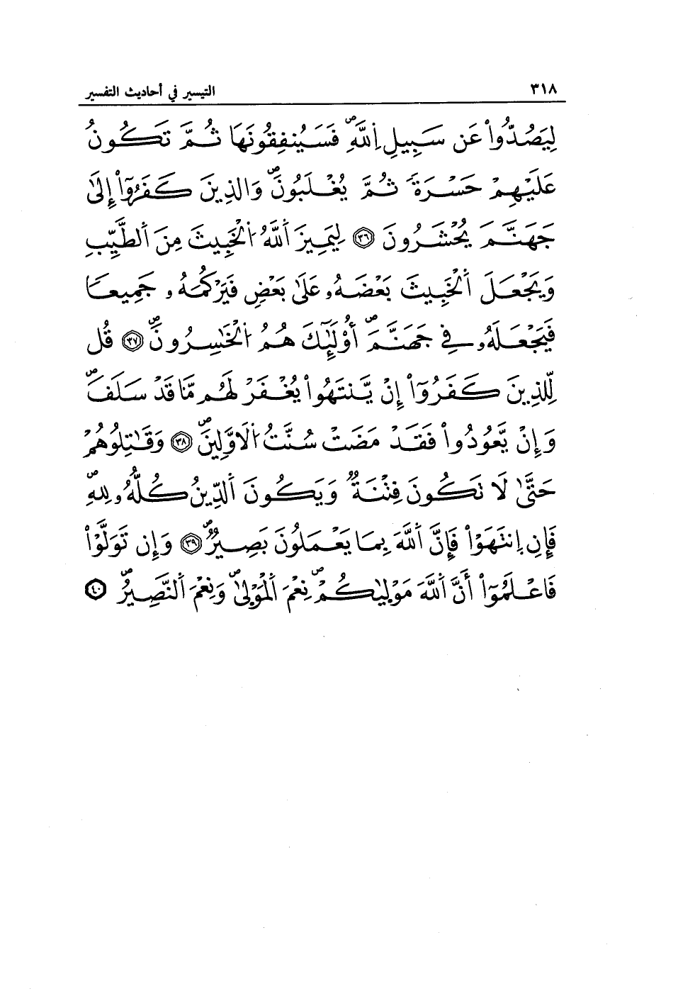 لِيَصُدُّوا عَنْ سَبِيلِ اللَّهِ فَسَيُنْفِقُونَهَا ثُمَّ تَكُونُ عَلَيْهِمْ حَسْرَةً ثُمَّ يُغْلَبُونَ وَالَّذِينَ كَفَرُوا إِلَى جَهَنَّمَ يُحْشَرُونَ (36) لِيَمِيزَ اللَّهُ الْخَبِيثَ مِنَ الطَّيِّبِ وَيَجْعَلَ الْخَبِيثَ بَعْضَهُ عَلَى بَعْضٍ فَيَرْكُمَهُ جَمِيعًا فَيَجْعَلَهُ فِي جَهَنَّمَ أُولَئِكَ هُمُ الْخَاسِرُونَ (37) قُلْ لِلَّذِينَ كَفَرُوا إِنْ يَنْتَهُوا يُغْفَرْ لَهُمْ مَا قَدْ سَلَفَ وَإِنْ يَعُودُوا فَقَدْ مَضَتْ سُنَّتُ الْأَوَّلِينَ (38) وَقَاتِلُوهُمْ حَتَّى لَا تَكُونَ فِتْنَةٌ وَيَكُونَ الدِّينُ كُلُّهُ لِلَّهِ فَإِنِ انْتَهَوْا فَإِنَّ اللَّهَ بِمَا يَعْمَلُونَ بَصِيرٌ (39) وَإِنْ تَوَلَّوْا فَاعْلَمُوا أَنَّ اللَّهَ مَوْلَاكُمْ نِعْمَ الْمَوْلَى وَنِعْمَ النَّصِيرُ (40)
