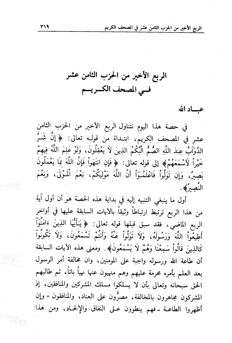 في حصة هذا اليوم نتناول الربع الأخير من الحزب الثامن عشر في المصحف الكريم، ابتداء من قوله تعالى: {إِنَّ شَرَّ الدَّوَابِّ عِنْدَ اللَّهِ الصُّمُّ الْبُكْمُ الَّذِينَ لَا يَعْقِلُونَ * وَلَوْ عَلِمَ اللَّهُ فِيهِمْ خَيْرًا لَأَسْمَعَهُمْ} إلى قوله تعالى: {فَإِنِ انْتَهَوْا فَإِنَّ اللَّهَ بِمَا يَعْمَلُونَ بَصِيرٌ * وَإِنْ تَوَلَّوْا فَاعْلَمُوا أَنَّ اللَّهَ مَوْلَاكُمْ نِعْمَ الْمَوْلَى وَنِعْمَ النَّصِيرُ}.