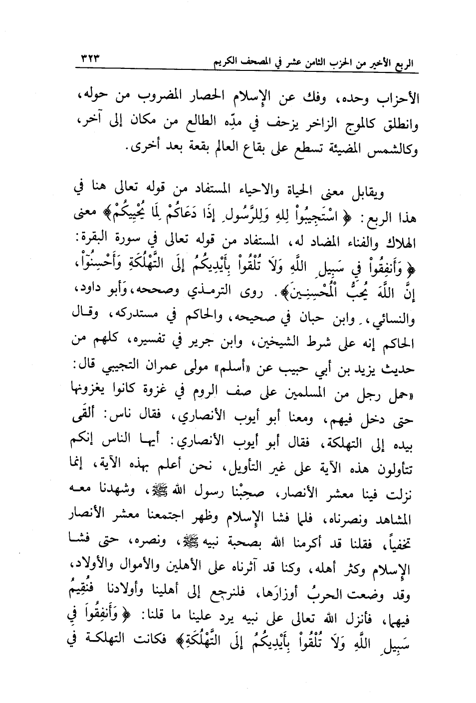 ويقابل معنى الحياة والإحياء المستفاد من قوله تعالى هنا في هذا الربع: {اسْتَجِيبُوا لِلَّهِ وَلِلرَّسُولِ إِذَا دَعَاكُمْ لِمَا يُحْيِيكُمْ} معنى الهلاك والفناء المضاد له، المستفاد من قوله تعالى في سورة البقرة: {وَأَنْفِقُوا فِي سَبِيلِ اللَّهِ وَلَا تُلْقُوا بِأَيْدِيكُمْ إِلَى التَّهْلُكَةِ وَأَحْسِنُوا إِنَّ اللَّهَ يُحِبُّ الْمُحْسِنِينَ}. روى الترمذي وصححه، وأبو داوود، والنسائي، وابن حبان في صحيحه، والحاكم في مستدركه، وقال الحاكم إنه على شرط الشيخين، وابن جرير في تفسيره، كلهم من حديث يزيد ابن أبي حبيب عن " أسلم " مولى عمران التجيبي قال: " حمل رجل من المسلمين على صف الروم في غزوة كانوا يغزونها حتى دخل فيهم، ومعنا أبو أيوب الأنصاري، فقال ناس: ألقى بيده إلى التهلكة، فقال أبو أيوب الأنصاري، أيها الناس إنكم تتأولون هذه الآية على غير التأويل، نحن أعلم بهذه الآية، إنما نزلت فينا معشر الأنصار، صحبنا رسول الله صلى الله عليه وسلم، وشهدنا معه المشاهد ونصرناه، فلما فشا الإسلام وظهر واجتمعنا معشر الأنصار تخفيا، فقلنا قد أكرمنا الله بصحبة نبيه صلى الله عليه وسلم، ونصره، حتى فشا الإسلام وكثر أهله، وكنا قد آثرناه على الأهلين والأموال والأولاد، وقد وضعت الحرب أوزارها، فنرجع إلى أهلينا وأولادنا فنقيم فيهما، فأنزل الله تعالى على نبيه يرد علينا ما قلنا: {وَأَنْفِقُوا فِي سَبِيلِ اللَّهِ وَلَا تُلْقُوا بِأَيْدِيكُمْ إِلَى التَّهْلُكَةِ} فكانت التهلكة في