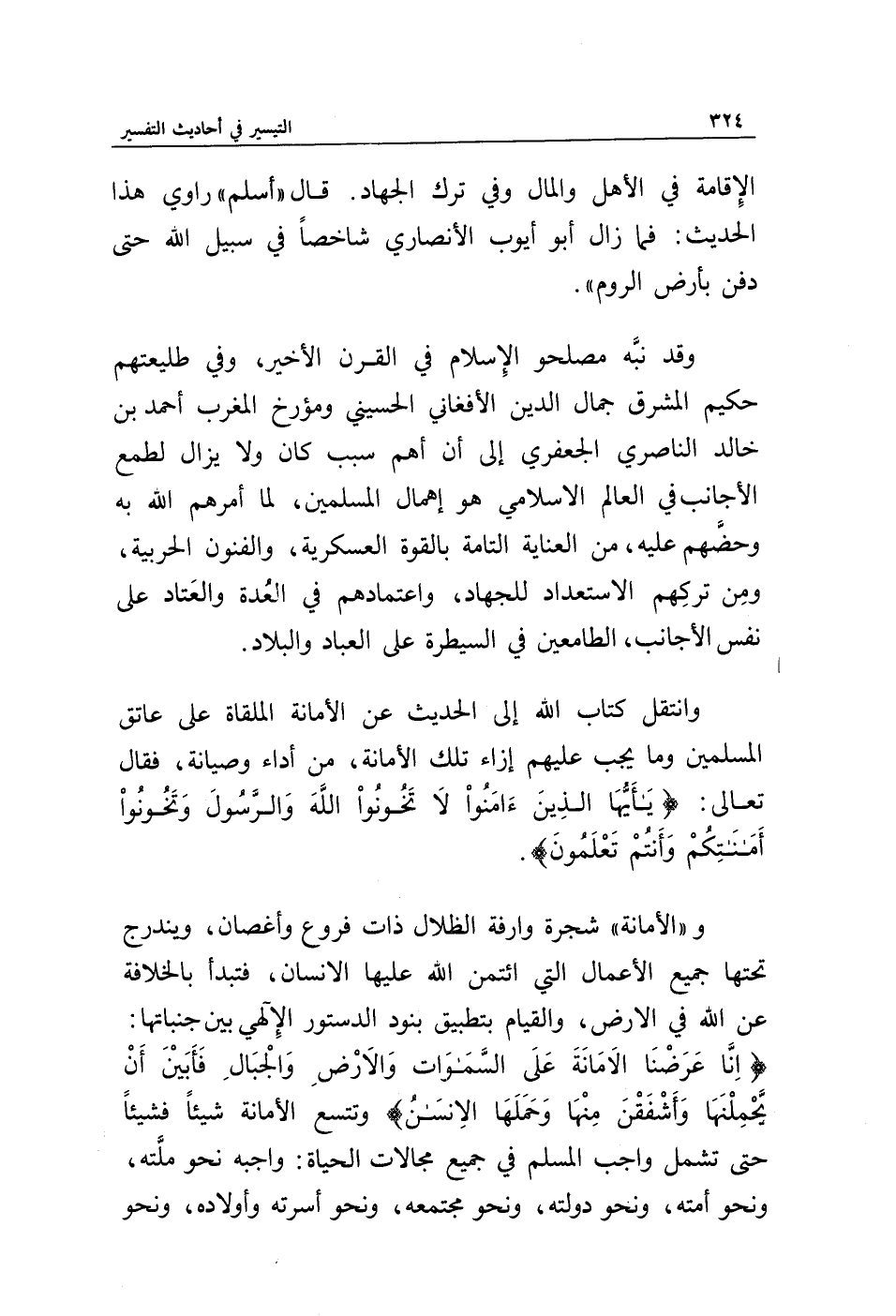 الإقامة في الأهل والمال وفي ترك الجهاد. قال " أسلم " راوي هذا الحديث: فما زال أبو أيوب الأنصاري شاخصا في سبيل الله حتى دفن بأرض الروم.