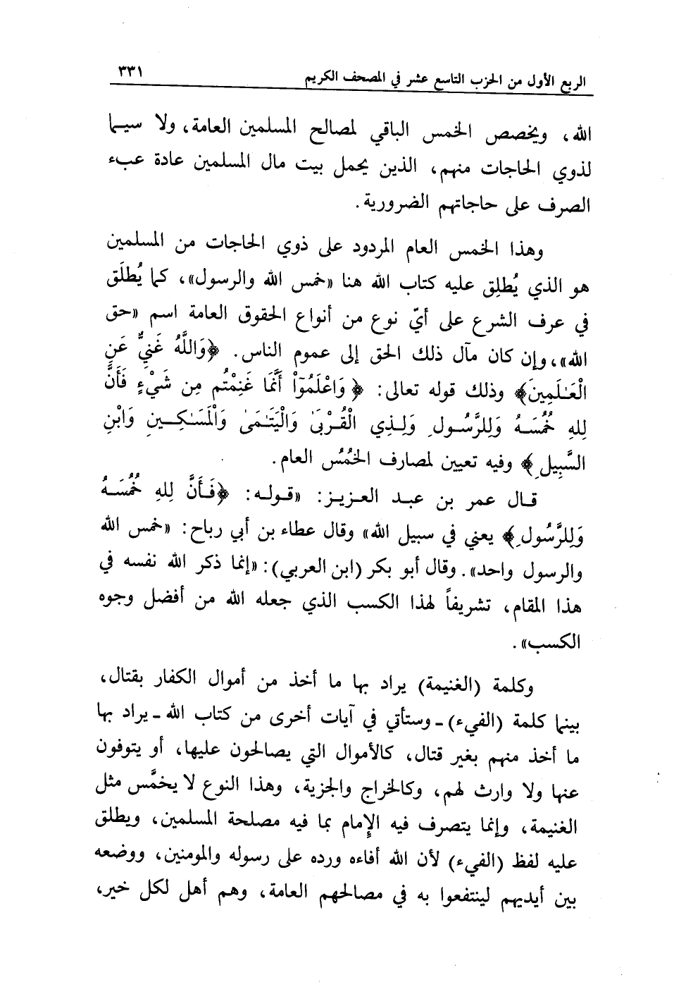 وهذا الخمس العام المردود على ذوي الحاجات من المسلمين هو الذي يطلق عليه كتاب الله هنا {خمس الله والرسول} كما يطلق في عرف الشرع على أي نوع من أنواع الحقوق العامة اسم " حق الله " وإن كان مآل ذلك الحق إلى عموم الناس. {فَإِنَّ اللَّهَ غَنِيٌّ عَنِ الْعَالَمِينَ} وذلك قوله تعالى: {وَاعْلَمُوا أَنَّمَا غَنِمْتُمْ مِنْ شَيْءٍ فَأَنَّ لِلَّهِ خُمُسَهُ وَلِلرَّسُولِ وَلِذِي الْقُرْبَى وَالْيَتَامَى وَالْمَسَاكِينِ وَابْنِ السَّبِيلِ} وفيه تعيين لمصارف الخمس العام.