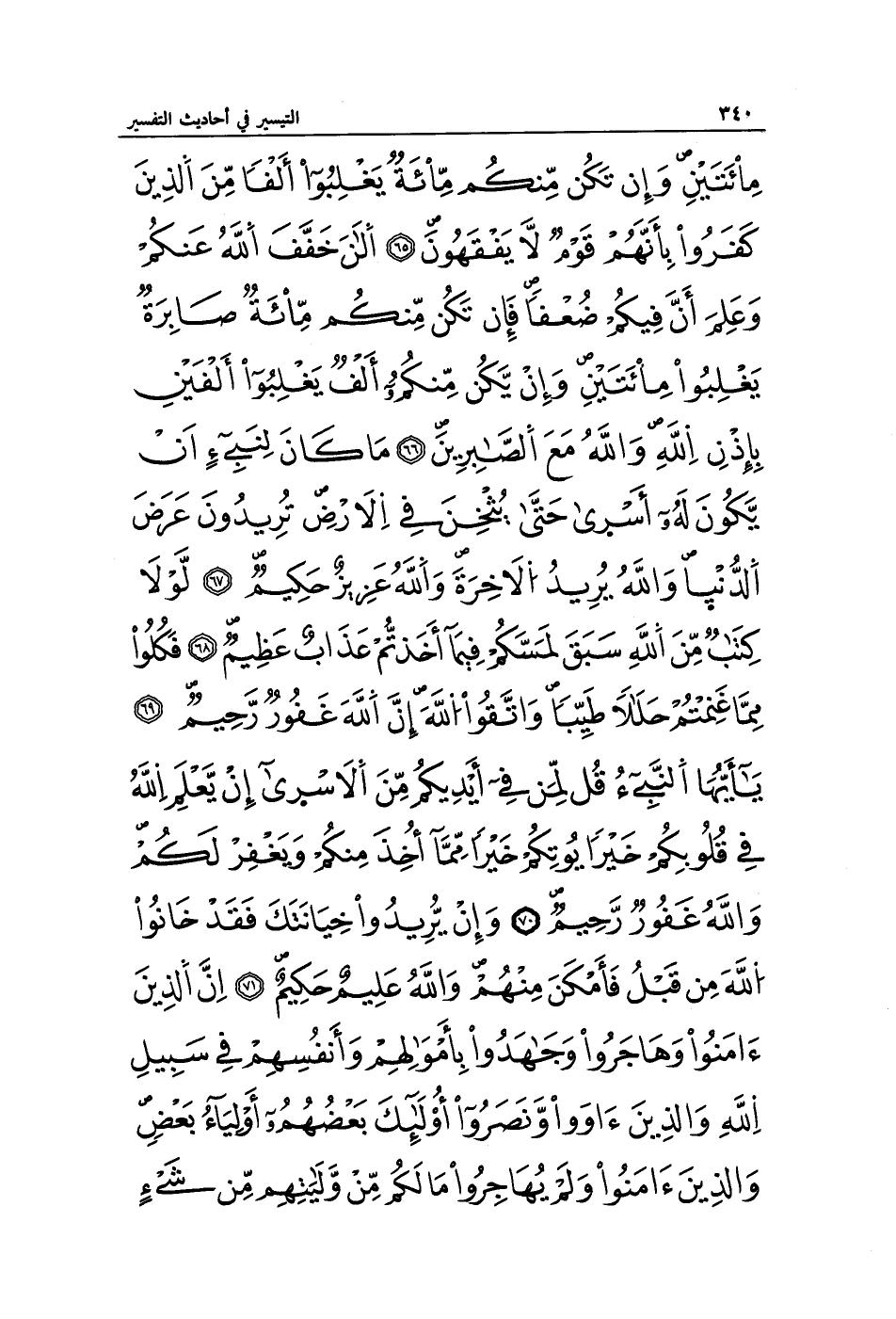 مِائَتَيْنِ وَإِنْ يَكُنْ مِنْكُمْ مِائَةٌ يَغْلِبُوا أَلْفًا مِنَ الَّذِينَ كَفَرُوا بِأَنَّهُمْ قَوْمٌ لَا يَفْقَهُونَ (65) الْآنَ خَفَّفَ اللَّهُ عَنْكُمْ وَعَلِمَ أَنَّ فِيكُمْ ضَعْفًا فَإِنْ يَكُنْ مِنْكُمْ مِائَةٌ صَابِرَةٌ يَغْلِبُوا مِائَتَيْنِ وَإِنْ يَكُنْ مِنْكُمْ أَلْفٌ يَغْلِبُوا أَلْفَيْنِ بِإِذْنِ اللَّهِ وَاللَّهُ مَعَ الصَّابِرِينَ (66) مَا كَانَ لِنَبِيٍّ أَنْ يَكُونَ لَهُ أَسْرَى حَتَّى يُثْخِنَ فِي الْأَرْضِ تُرِيدُونَ عَرَضَ الدُّنْيَا وَاللَّهُ يُرِيدُ الْآخِرَةَ وَاللَّهُ عَزِيزٌ حَكِيمٌ (67) لَوْلَا كِتَابٌ مِنَ اللَّهِ سَبَقَ لَمَسَّكُمْ فِيمَا أَخَذْتُمْ عَذَابٌ عَظِيمٌ (68) فَكُلُوا مِمَّا غَنِمْتُمْ حَلَالًا طَيِّبًا وَاتَّقُوا اللَّهَ إِنَّ اللَّهَ غَفُورٌ رَحِيمٌ (69) يَا أَيُّهَا النَّبِيُّ قُلْ لِمَنْ فِي أَيْدِيكُمْ مِنَ الْأَسْرَى إِنْ يَعْلَمِ اللَّهُ فِي قُلُوبِكُمْ خَيْرًا يُؤْتِكُمْ خَيْرًا مِمَّا أُخِذَ مِنْكُمْ وَيَغْفِرْ لَكُمْ وَاللَّهُ غَفُورٌ رَحِيمٌ (70) وَإِنْ يُرِيدُوا خِيَانَتَكَ فَقَدْ خَانُوا اللَّهَ مِنْ قَبْلُ فَأَمْكَنَ مِنْهُمْ وَاللَّهُ عَلِيمٌ حَكِيمٌ (71) إِنَّ الَّذِينَ آمَنُوا وَهَاجَرُوا وَجَاهَدُوا بِأَمْوَالِهِمْ وَأَنْفُسِهِمْ فِي سَبِيلِ اللَّهِ وَالَّذِينَ آوَوْا وَنَصَرُوا أُولَئِكَ بَعْضُهُمْ أَوْلِيَاءُ بَعْضٍ وَالَّذِينَ آمَنُوا وَلَمْ يُهَاجِرُوا مَا لَكُمْ مِنْ وَلَايَتِهِمْ مِنْ شَيْءٍ
