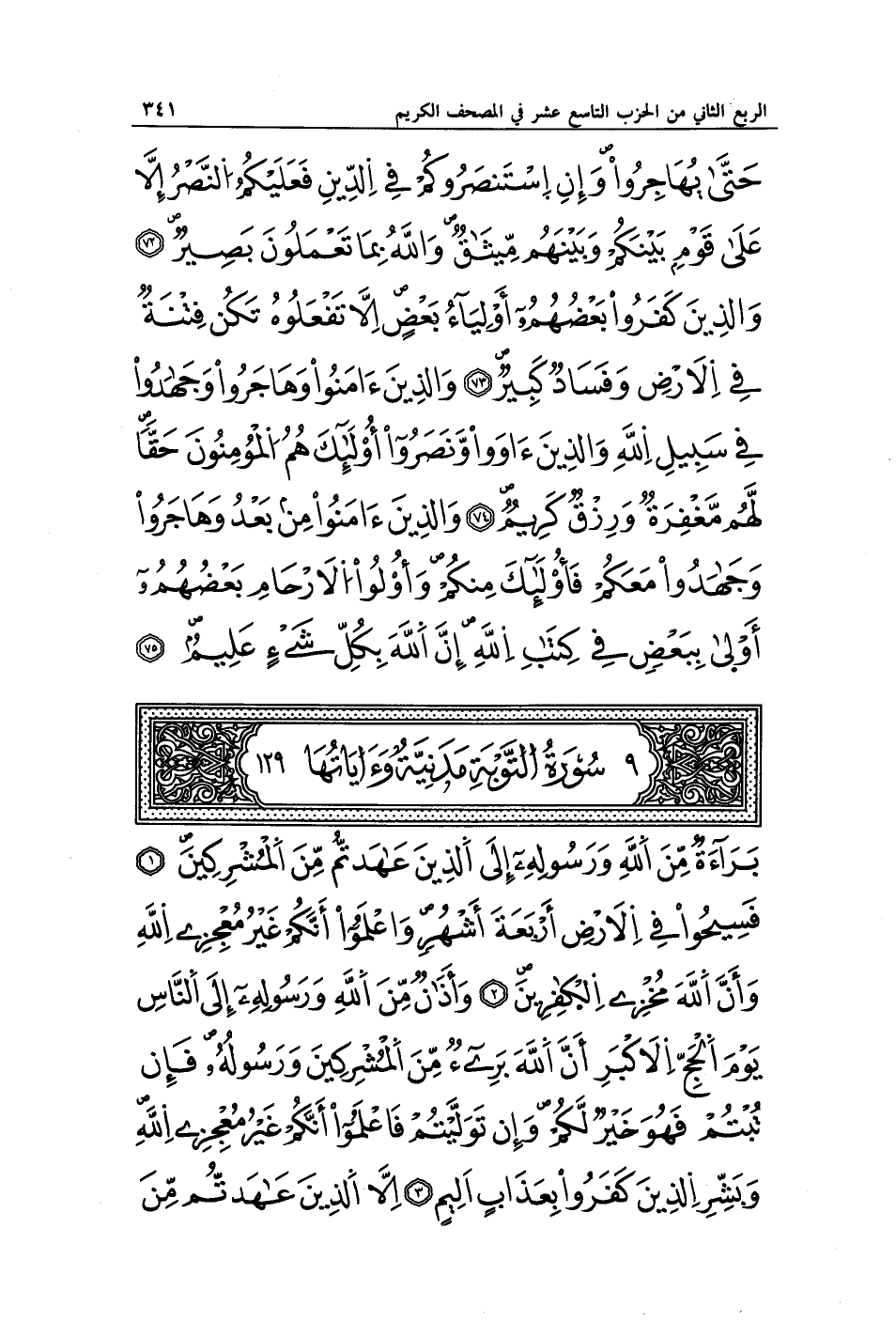 بَرَاءَةٌ مِنَ اللَّهِ وَرَسُولِهِ إِلَى الَّذِينَ عَاهَدْتُمْ مِنَ الْمُشْرِكِينَ (1) فَسِيحُوا فِي الْأَرْضِ أَرْبَعَةَ أَشْهُرٍ وَاعْلَمُوا أَنَّكُمْ غَيْرُ مُعْجِزِي اللَّهِ وَأَنَّ اللَّهَ مُخْزِي الْكَافِرِينَ (2) وَأَذَانٌ مِنَ اللَّهِ وَرَسُولِهِ إِلَى النَّاسِ يَوْمَ الْحَجِّ الْأَكْبَرِ أَنَّ اللَّهَ بَرِيءٌ مِنَ الْمُشْرِكِينَ وَرَسُولُهُ فَإِنْ تُبْتُمْ فَهُوَ خَيْرٌ لَكُمْ وَإِنْ تَوَلَّيْتُمْ فَاعْلَمُوا أَنَّكُمْ غَيْرُ مُعْجِزِي اللَّهِ وَبَشِّرِ الَّذِينَ كَفَرُوا بِعَذَابٍ أَلِيمٍ (3) إِلَّا الَّذِينَ عَاهَدْتُمْ مِنَ
