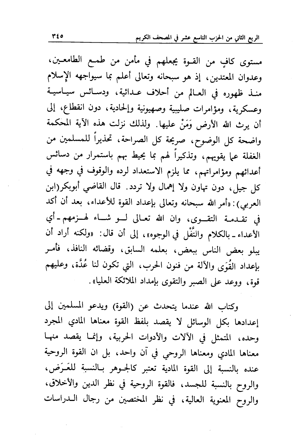 وكتاب الله عندما يتحدث عن " القوة " ويدعو المسلمين إلى إعدادها بكل الوسائل لا يقصد بلفظ القوة معناها المادي المجرد وحده، المتمثل في الآلات والأدوات الحربية، وإنما يقصد منها معناها المادي ومعناها الروحي في آن واحد، بل إن القوة الروحية عنده بالنسبة إلى القوة المادية تعتبر كالجوهر بالنسبة للعرض، والروح بالنسبة للجسد، فالقوة الروحية في نظر الدين والأخلاق، والروح المعنوية العالية، في نظر المختصين من رجال الدراسات