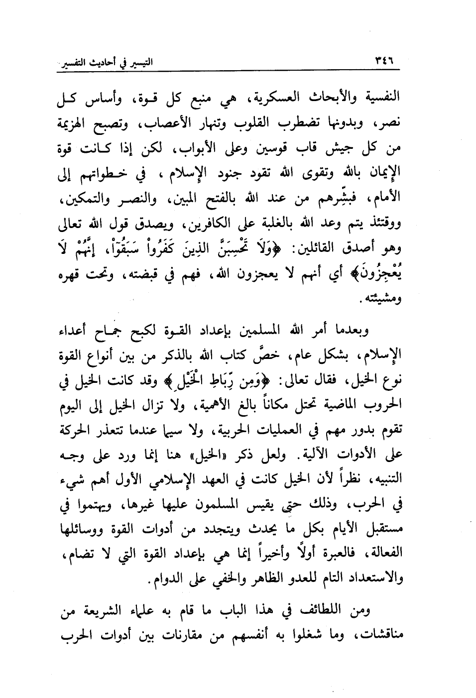 النفسية والأبحاث العسكرية، هي منبع كل قوة، وأساس كل نصر، وبدونها تضطرب القلوب وتنهار الأعصاب، وتصبح الهزيمة من كل جيش قاب قوسين وعلى الأبواب، لكن إذا كانت قوة الإيمان بالله وتقوى الله تقود جنود الإسلام، في خطواتهم إلى الأمام، فبشرهم من عند الله بالفتح المبين، والنصر والتمكين، ووقتئذ يتم وعد الله بالغلبة على الكافرين، ويصدق قول الله تعالى وهو أصدق القائلين: {وَلَا يَحْسَبَنَّ الَّذِينَ كَفَرُوا سَبَقُوا إِنَّهُمْ لَا يُعْجِزُونَ} أي أنهم لا يعجزون الله، فهم في قبضته، وتحت قهره ومشيئته.