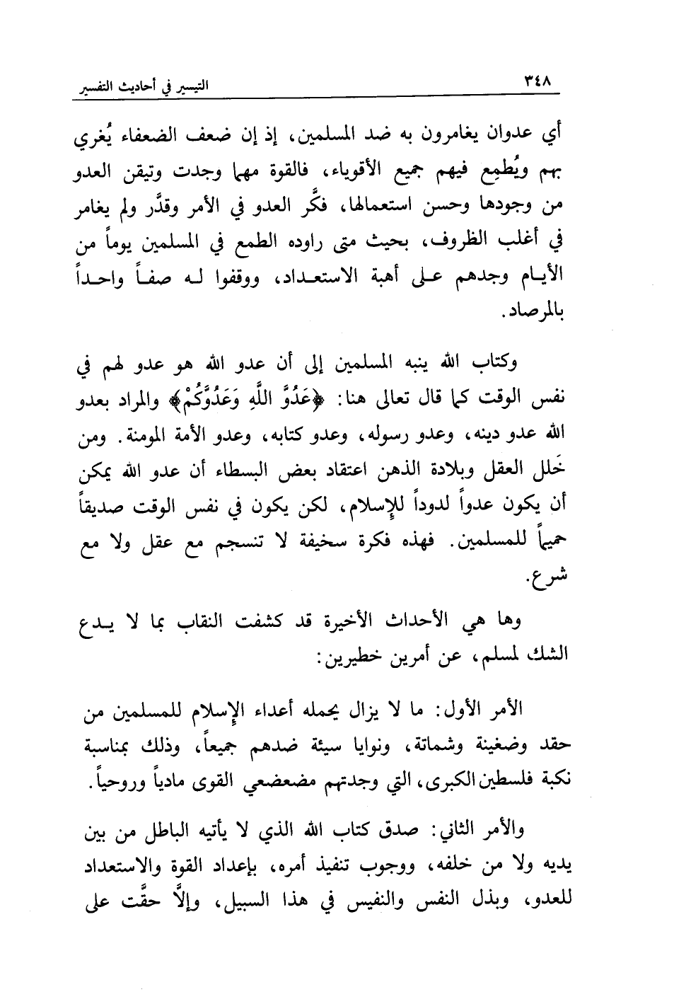 الأمر الأول: ما لا يزال يحمله أعداء الإسلام للمسلمين من حقد وضغينة وشماتة، ونوايا سيئة ضدهم جميعا، وذلك بمناسبة نكبة فلسطين الكبرى، التي وجدتهم مضعضعي القوى ماديا وروحيا.