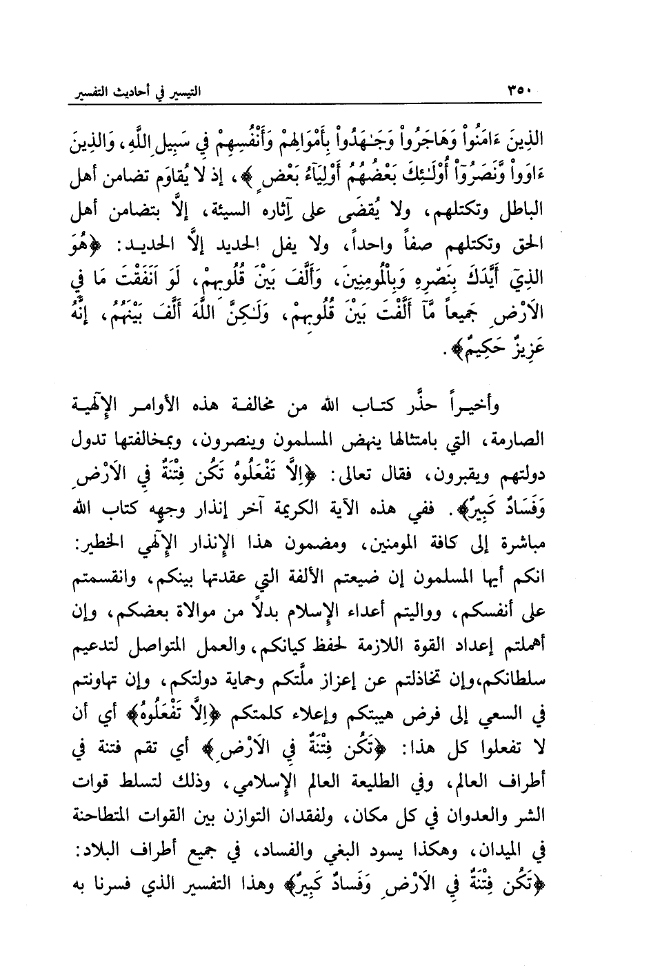 وأخيرا حذر كتاب الله من مخالفة هذه الأوامر الإلهية الصارمة، التي بامتثالها ينهض المسلمون وينصرون، وبمخالفتها تدول دولتهم ويقبرون، فقال تعالى: {إِلَّا تَفْعَلُوهُ تَكُنْ فِتْنَةٌ فِي الْأَرْضِ وَفَسَادٌ كَبِيرٌ}. ففي هذه الآية الكريمة آخر إنذار وجهه كتاب الله مباشرة إلى كافة المؤمنين، ومضمون هذا الإنذار الإلهي الخطير: إنكم أيها المسلمون إن ضيعتم الألفة التي عقدتها بينكم، وانقسمتم على أنفسكم، وواليتم أعداء الإسلام بدلا من موالاة بعضكم، وإن أهملتم إعداد القوة اللازمة لحفظ كيانكم، والعمل المتواصل لتدعيم سلطانكم، وإن تخاذلتم عن إعزاز ملتكم وحماية دولتكم، وإن تهاونتم في السعي إلى فرض هيبتكم وإعلاء كلمتكم {إِلَّا تَفْعَلُوهُ} أي أن لا تفعلوا كل هذا: {تَكُنْ فِتْنَةٌ فِي الْأَرْضِ} أي تقم فتنة في أطراف العالم، وفي طليعة العالم الإسلامي، وذلك لتسلط قوات الشر والعدوان في كل مكان، ولفقدان التوازن بين القوات المتطاحنة في الميدان، وهكذا يسود البغي والفساد، في جميع أطراف البلاد: {تَكُنْ فِتْنَةٌ فِي الْأَرْضِ وَفَسَادٌ كَبِيرٌ} وهذا التفسير الذي فسرنا به