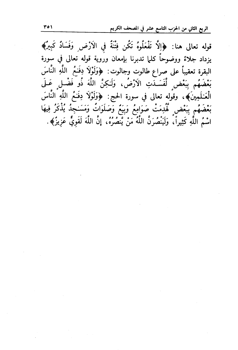 قوله تعالى هنا: {إِلَّا تَفْعَلُوهُ تَكُنْ فِتْنَةٌ فِي الْأَرْضِ وَفَسَادٌ كَبِيرٌ}، يزداد جلاء ووضوحا كلما تدبرنا بإمعان وروية قوله تعالى في سورة البقرة تعقيبا على صراع طالوت وجالوت: {وَلَوْلَا دَفْعُ اللَّهِ النَّاسَ بَعْضَهُمْ بِبَعْضٍ لَفَسَدَتِ الْأَرْضُ وَلَكِنَّ اللَّهَ ذُو فَضْلٍ عَلَى الْعَالَمِينَ}، وقوله تعالى في سورة الحج: {وَلَوْلَا دَفْعُ اللَّهِ النَّاسَ بَعْضَهُمْ بِبَعْضٍ لَهُدِّمَتْ صَوَامِعُ وَبِيَعٌ وَصَلَوَاتٌ وَمَسَاجِدُ يُذْكَرُ فِيهَا اسْمُ اللَّهِ كَثِيرًا وَلَيَنْصُرَنَّ اللَّهُ مَنْ يَنْصُرُهُ إِنَّ اللَّهَ لَقَوِيٌّ عَزِيزٌ}.