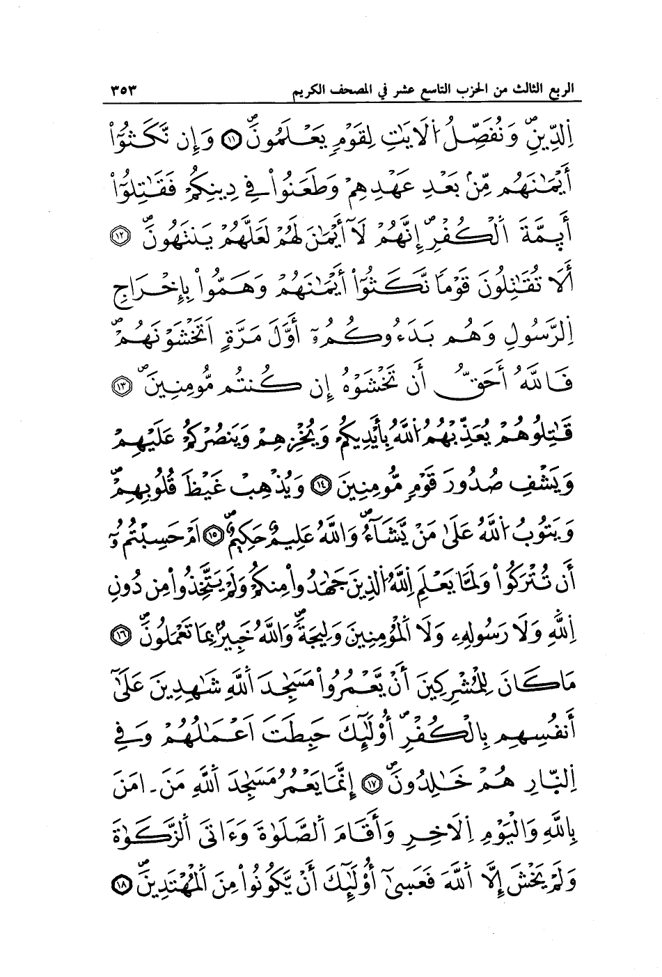 الدِّينِ وَنُفَصِّلُ الْآيَاتِ لِقَوْمٍ يَعْلَمُونَ (11) وَإِنْ نَكَثُوا أَيْمَانَهُمْ مِنْ بَعْدِ عَهْدِهِمْ وَطَعَنُوا فِي دِينِكُمْ فَقَاتِلُوا أَئِمَّةَ الْكُفْرِ إِنَّهُمْ لَا أَيْمَانَ لَهُمْ لَعَلَّهُمْ يَنْتَهُونَ (12) أَلَا تُقَاتِلُونَ قَوْمًا نَكَثُوا أَيْمَانَهُمْ وَهَمُّوا بِإِخْرَاجِ الرَّسُولِ وَهُمْ بَدَءُوكُمْ أَوَّلَ مَرَّةٍ أَتَخْشَوْنَهُمْ فَاللَّهُ أَحَقُّ أَنْ تَخْشَوْهُ إِنْ كُنْتُمْ مُؤْمِنِينَ (13) قَاتِلُوهُمْ يُعَذِّبْهُمُ اللَّهُ بِأَيْدِيكُمْ وَيُخْزِهِمْ وَيَنْصُرْكُمْ عَلَيْهِمْ وَيَشْفِ صُدُورَ قَوْمٍ مُؤْمِنِينَ (14) وَيُذْهِبْ غَيْظَ قُلُوبِهِمْ وَيَتُوبُ اللَّهُ عَلَى مَنْ يَشَاءُ وَاللَّهُ عَلِيمٌ حَكِيمٌ (15) أَمْ حَسِبْتُمْ أَنْ تُتْرَكُوا وَلَمَّا يَعْلَمِ اللَّهُ الَّذِينَ جَاهَدُوا مِنْكُمْ وَلَمْ يَتَّخِذُوا مِنْ دُونِ اللَّهِ وَلَا رَسُولِهِ وَلَا الْمُؤْمِنِينَ وَلِيجَةً وَاللَّهُ خَبِيرٌ بِمَا تَعْمَلُونَ (16) مَا كَانَ لِلْمُشْرِكِينَ أَنْ يَعْمُرُوا مَسَاجِدَ اللَّهِ شَاهِدِينَ عَلَى أَنْفُسِهِمْ بِالْكُفْرِ أُولَئِكَ حَبِطَتْ أَعْمَالُهُمْ وَفِي النَّارِ هُمْ خَالِدُونَ (17) إِنَّمَا يَعْمُرُ مَسَاجِدَ اللَّهِ مَنْ آمَنَ بِاللَّهِ وَالْيَوْمِ الْآخِرِ وَأَقَامَ الصَّلَاةَ وَآتَى الزَّكَاةَ وَلَمْ يَخْشَ إِلَّا اللَّهَ فَعَسَى أُولَئِكَ أَنْ يَكُونُوا مِنَ الْمُهْتَدِينَ (18)