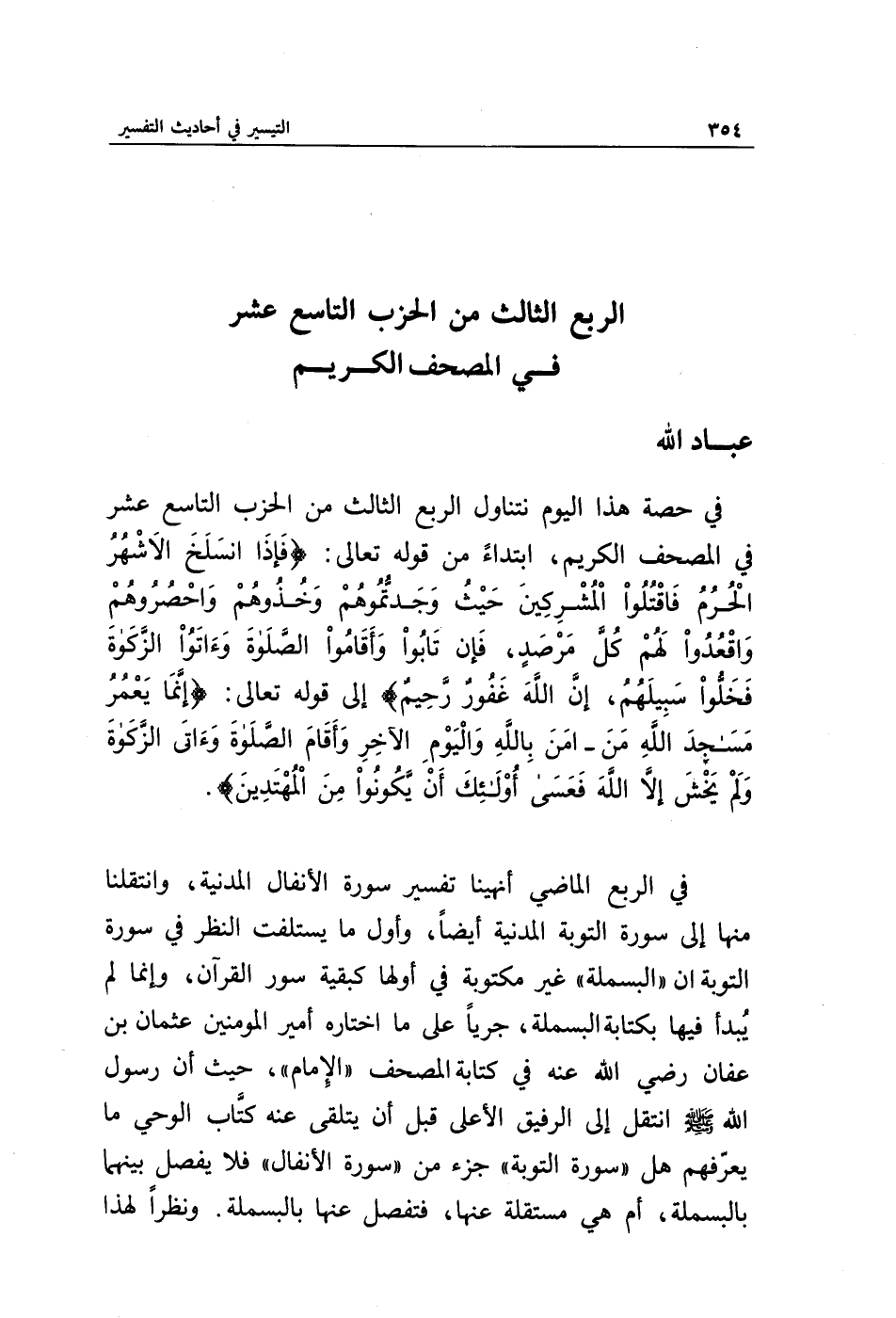 في حصة هذا اليوم نتناول الربع الثالث من الحزب التاسع عشر في المصحف الكريم، ابتداء من قوله تعالى: {فَإِذَا انْسَلَخَ الْأَشْهُرُ الْحُرُمُ فَاقْتُلُوا الْمُشْرِكِينَ حَيْثُ وَجَدْتُمُوهُمْ وَخُذُوهُمْ وَاحْصُرُوهُمْ وَاقْعُدُوا لَهُمْ كُلَّ مَرْصَدٍ فَإِنْ تَابُوا وَأَقَامُوا الصَّلَاةَ وَآتَوُا الزَّكَاةَ فَخَلُّوا سَبِيلَهُمْ إِنَّ اللَّهَ غَفُورٌ رَحِيمٌ} إلى قوله تعالى: {إِنَّمَا يَعْمُرُ مَسَاجِدَ اللَّهِ مَنْ آمَنَ بِاللَّهِ وَالْيَوْمِ الْآخِرِ وَأَقَامَ الصَّلَاةَ وَآتَى الزَّكَاةَ وَلَمْ يَخْشَ إِلَّا اللَّهَ فَعَسَى أُولَئِكَ أَنْ يَكُونُوا مِنَ الْمُهْتَدِينَ}.