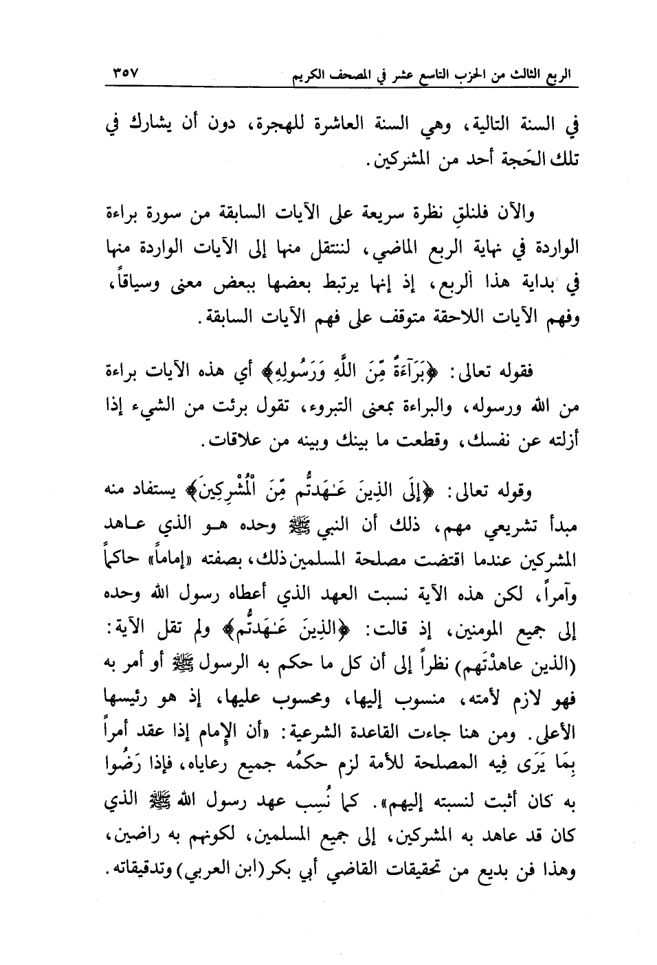 وقوله تعالى: {إِلَى الَّذِينَ عَاهَدْتُمْ مِنَ الْمُشْرِكِينَ} يستفاد منه مبدأ تشريعي مهم، ذلك أن النبي صلى الله عليه وسلم وحده هو الذي عاهد المشركين عندما اقتضت مصلحة المسلمين ذلك، بصفته " إماما " حاكما وآمرا، لكن هذه الآية نسبت العهد الذي أعطاه رسول الله صلى الله عليه وسلم وحده إلى جميع المؤمنين، إذ قالت: {الَّذِينَ عَاهَدْتُمْ} ولم تقل الآية: {الَّذِينَ عَاهَدْتُمْ} نظرا إلى أن كل ما حكم به الرسول صلى الله عليه وسلم أو أمر به فهو لازم لأمته، منسوب إليها، ومحسوب عليها، إذ هو رئيسها الأعلى. ومن هنا جاءت القاعدة الشرعية: " أن الإمام إذا عقد أمرا بما يرى فيه المصلحة للأمة لزم حكمه جميع رعاياه، فإذا رضوا به كان أثبت لنسبته إليهم}. كما نسب عهد الرسول صلى الله عليه وسلم الذي كان قد عاهد به المشركين، إلى جميع المسلمين، لكونهم به راضين، وهذا فن بديع من تحقيقات القاضي أبي بكر " ابن العربي " وتدقيقاته.