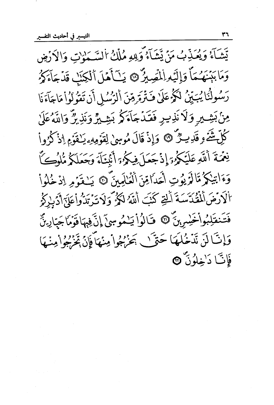 يَشَاءُ وَيُعَذِّبُ مَنْ يَشَاءُ وَلِلَّهِ مُلْكُ السَّمَاوَاتِ وَالْأَرْضِ وَمَا بَيْنَهُمَا وَإِلَيْهِ الْمَصِيرُ (18) يَا أَهْلَ الْكِتَابِ قَدْ جَاءَكُمْ رَسُولُنَا يُبَيِّنُ لَكُمْ عَلَى فَتْرَةٍ مِنَ الرُّسُلِ أَنْ تَقُولُوا مَا جَاءَنَا مِنْ بَشِيرٍ وَلَا نَذِيرٍ فَقَدْ جَاءَكُمْ بَشِيرٌ وَنَذِيرٌ وَاللَّهُ عَلَى كُلِّ شَيْءٍ قَدِيرٌ (19) وَإِذْ قَالَ مُوسَى لِقَوْمِهِ يَا قَوْمِ اذْكُرُوا نِعْمَةَ اللَّهِ عَلَيْكُمْ إِذْ جَعَلَ فِيكُمْ أَنْبِيَاءَ وَجَعَلَكُمْ مُلُوكًا وَآتَاكُمْ مَا لَمْ يُؤْتِ أَحَدًا مِنَ الْعَالَمِينَ (20) يَا قَوْمِ ادْخُلُوا الْأَرْضَ الْمُقَدَّسَةَ الَّتِي كَتَبَ اللَّهُ لَكُمْ وَلَا تَرْتَدُّوا عَلَى أَدْبَارِكُمْ فَتَنْقَلِبُوا خَاسِرِينَ (21) قَالُوا يَا مُوسَى إِنَّ فِيهَا قَوْمًا جَبَّارِينَ وَإِنَّا لَنْ نَدْخُلَهَا حَتَّى يَخْرُجُوا مِنْهَا فَإِنْ يَخْرُجُوا مِنْهَا فَإِنَّا دَاخِلُونَ (22)