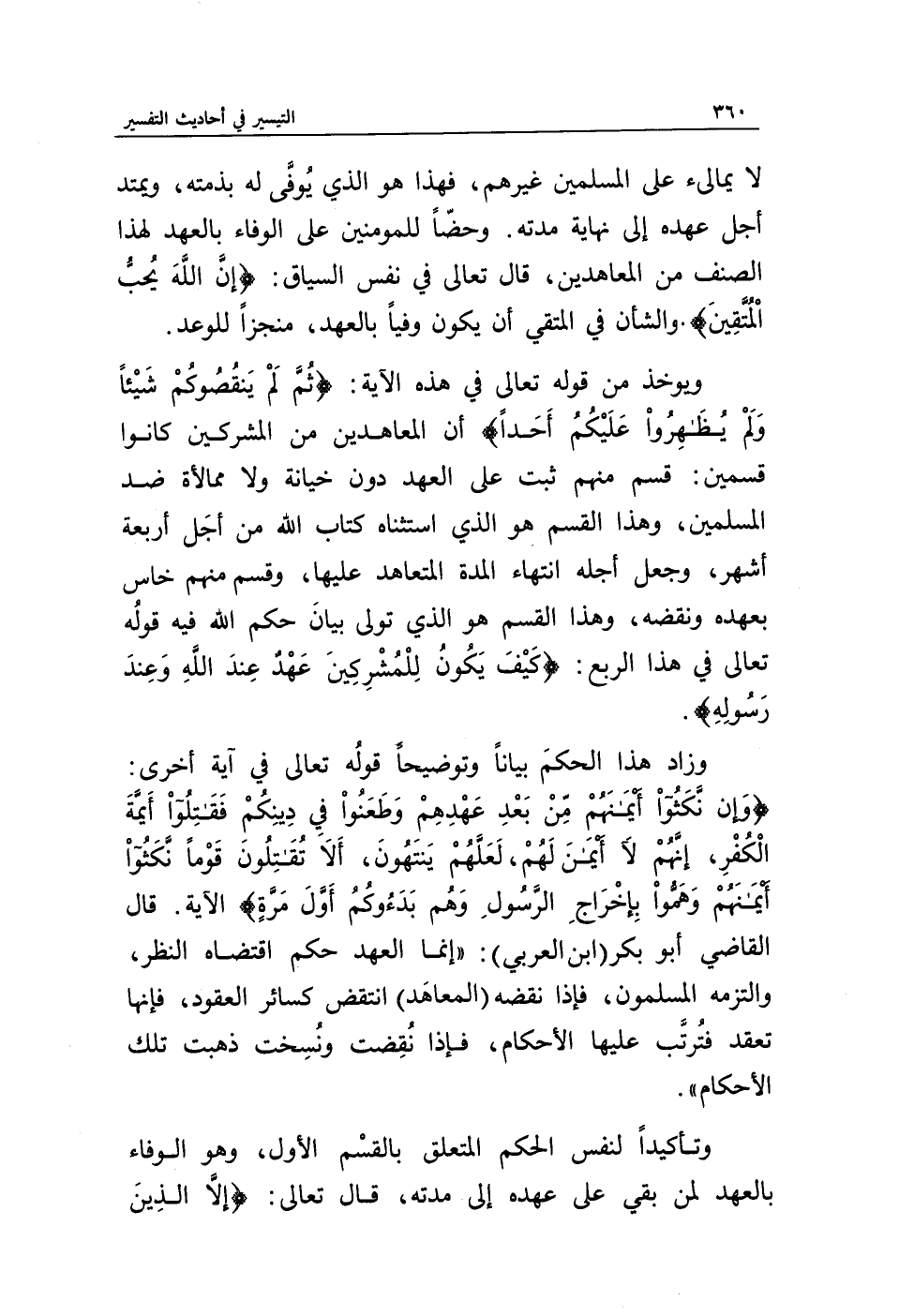 لا يمالئ على المسلمين غيرهم، فهذا هو الذي يوفى له بذمته، ويمتد أجل عهده إلى نهاية مدته. وحضا للمؤمنين على الوفاء بالعهد لهذا الصنف من المعاهدين، قال تعالى في نفس السياق: {إِنَّ اللَّهَ يُحِبُّ الْمُتَّقِينَ} والشأن في المتقي أن يكون وفيا بالعهد، منجزا للوعد.