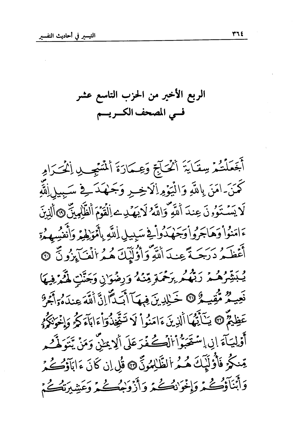 أَجَعَلْتُمْ سِقَايَةَ الْحَاجِّ وَعِمَارَةَ الْمَسْجِدِ الْحَرَامِ كَمَنْ آمَنَ بِاللَّهِ وَالْيَوْمِ الْآخِرِ وَجَاهَدَ فِي سَبِيلِ اللَّهِ لَا يَسْتَوُونَ عِنْدَ اللَّهِ وَاللَّهُ لَا يَهْدِي الْقَوْمَ الظَّالِمِينَ (19) الَّذِينَ آمَنُوا وَهَاجَرُوا وَجَاهَدُوا فِي سَبِيلِ اللَّهِ بِأَمْوَالِهِمْ وَأَنْفُسِهِمْ أَعْظَمُ دَرَجَةً عِنْدَ اللَّهِ وَأُولَئِكَ هُمُ الْفَائِزُونَ (20) يُبَشِّرُهُمْ رَبُّهُمْ بِرَحْمَةٍ مِنْهُ وَرِضْوَانٍ وَجَنَّاتٍ لَهُمْ فِيهَا نَعِيمٌ مُقِيمٌ (21) خَالِدِينَ فِيهَا أَبَدًا إِنَّ اللَّهَ عِنْدَهُ أَجْرٌ عَظِيمٌ (22) يَا أَيُّهَا الَّذِينَ آمَنُوا لَا تَتَّخِذُوا آبَاءَكُمْ وَإِخْوَانَكُمْ أَوْلِيَاءَ إِنِ اسْتَحَبُّوا الْكُفْرَ عَلَى الْإِيمَانِ وَمَنْ يَتَوَلَّهُمْ مِنْكُمْ فَأُولَئِكَ هُمُ الظَّالِمُونَ (23) قُلْ إِنْ كَانَ آبَاؤُكُمْ وَأَبْنَاؤُكُمْ وَإِخْوَانُكُمْ وَأَزْوَاجُكُمْ وَعَشِيرَتُكُمْ