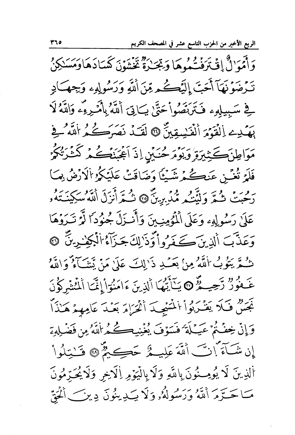 وَأَمْوَالٌ اقْتَرَفْتُمُوهَا وَتِجَارَةٌ تَخْشَوْنَ كَسَادَهَا وَمَسَاكِنُ تَرْضَوْنَهَا أَحَبَّ إِلَيْكُمْ مِنَ اللَّهِ وَرَسُولِهِ وَجِهَادٍ فِي سَبِيلِهِ فَتَرَبَّصُوا حَتَّى يَأْتِيَ اللَّهُ بِأَمْرِهِ وَاللَّهُ لَا يَهْدِي الْقَوْمَ الْفَاسِقِينَ (24) لَقَدْ نَصَرَكُمُ اللَّهُ فِي مَوَاطِنَ كَثِيرَةٍ وَيَوْمَ حُنَيْنٍ إِذْ أَعْجَبَتْكُمْ كَثْرَتُكُمْ فَلَمْ تُغْنِ عَنْكُمْ شَيْئًا وَضَاقَتْ عَلَيْكُمُ الْأَرْضُ بِمَا رَحُبَتْ ثُمَّ وَلَّيْتُمْ مُدْبِرِينَ (25) ثُمَّ أَنْزَلَ اللَّهُ سَكِينَتَهُ عَلَى رَسُولِهِ وَعَلَى الْمُؤْمِنِينَ وَأَنْزَلَ جُنُودًا لَمْ تَرَوْهَا وَعَذَّبَ الَّذِينَ كَفَرُوا وَذَلِكَ جَزَاءُ الْكَافِرِينَ (26) ثُمَّ يَتُوبُ اللَّهُ مِنْ بَعْدِ ذَلِكَ عَلَى مَنْ يَشَاءُ وَاللَّهُ غَفُورٌ رَحِيمٌ (27) يَا أَيُّهَا الَّذِينَ آمَنُوا إِنَّمَا الْمُشْرِكُونَ نَجَسٌ فَلَا يَقْرَبُوا الْمَسْجِدَ الْحَرَامَ بَعْدَ عَامِهِمْ هَذَا وَإِنْ خِفْتُمْ عَيْلَةً فَسَوْفَ يُغْنِيكُمُ اللَّهُ مِنْ فَضْلِهِ إِنْ شَاءَ إِنَّ اللَّهَ عَلِيمٌ حَكِيمٌ (28) قَاتِلُوا الَّذِينَ لَا يُؤْمِنُونَ بِاللَّهِ وَلَا بِالْيَوْمِ الْآخِرِ وَلَا يُحَرِّمُونَ مَا حَرَّمَ اللَّهُ وَرَسُولُهُ وَلَا يَدِينُونَ دِينَ الْحَقِّ