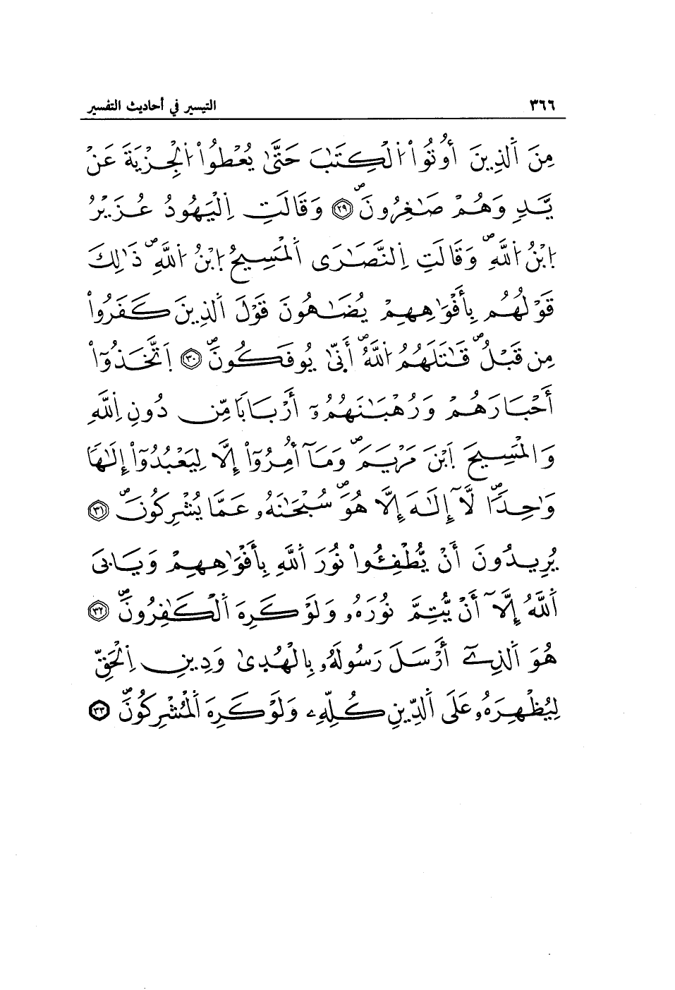 مِنَ الَّذِينَ أُوتُوا الْكِتَابَ حَتَّى يُعْطُوا الْجِزْيَةَ عَنْ يَدٍ وَهُمْ صَاغِرُونَ (29) وَقَالَتِ الْيَهُودُ عُزَيْرٌ ابْنُ اللَّهِ وَقَالَتِ النَّصَارَى الْمَسِيحُ ابْنُ اللَّهِ ذَلِكَ قَوْلُهُمْ بِأَفْوَاهِهِمْ يُضَاهِئُونَ قَوْلَ الَّذِينَ كَفَرُوا مِنْ قَبْلُ قَاتَلَهُمُ اللَّهُ أَنَّى يُؤْفَكُونَ (30) اتَّخَذُوا أَحْبَارَهُمْ وَرُهْبَانَهُمْ أَرْبَابًا مِنْ دُونِ اللَّهِ وَالْمَسِيحَ ابْنَ مَرْيَمَ وَمَا أُمِرُوا إِلَّا لِيَعْبُدُوا إِلَهًا وَاحِدًا لَا إِلَهَ إِلَّا هُوَ سُبْحَانَهُ عَمَّا يُشْرِكُونَ (31) يُرِيدُونَ أَنْ يُطْفِئُوا نُورَ اللَّهِ بِأَفْوَاهِهِمْ وَيَأْبَى اللَّهُ إِلَّا أَنْ يُتِمَّ نُورَهُ وَلَوْ كَرِهَ الْكَافِرُونَ (32) هُوَ الَّذِي أَرْسَلَ رَسُولَهُ بِالْهُدَى وَدِينِ الْحَقِّ لِيُظْهِرَهُ عَلَى الدِّينِ كُلِّهِ وَلَوْ كَرِهَ الْمُشْرِكُونَ (33)