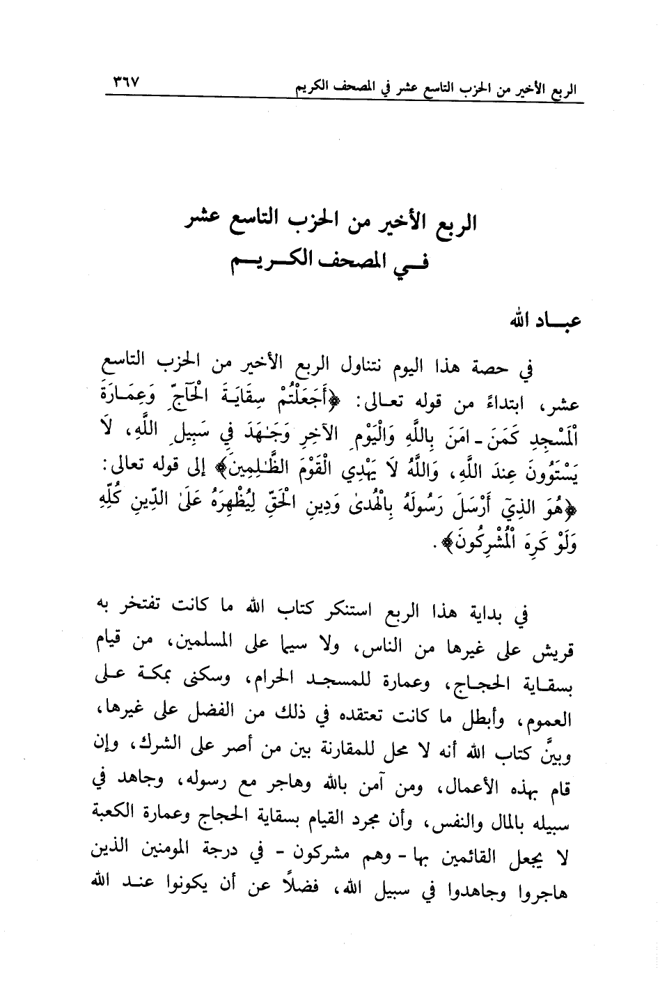 في حصة هذا اليوم نتناول الربع الأخير من الحزب التاسع عشر، ابتداء من قوله تعالى: {أَجَعَلْتُمْ سِقَايَةَ الْحَاجِّ وَعِمَارَةَ الْمَسْجِدِ الْحَرَامِ كَمَنْ آمَنَ بِاللَّهِ وَالْيَوْمِ الْآخِرِ وَجَاهَدَ فِي سَبِيلِ اللَّهِ لَا يَسْتَوُونَ عِنْدَ اللَّهِ وَاللَّهُ لَا يَهْدِي الْقَوْمَ الظَّالِمِينَ} إلى قوله تعالى: {هُوَ الَّذِي أَرْسَلَ رَسُولَهُ بِالْهُدَى وَدِينِ الْحَقِّ لِيُظْهِرَهُ عَلَى الدِّينِ كُلِّهِ وَلَوْ كَرِهَ الْمُشْرِكُونَ}.