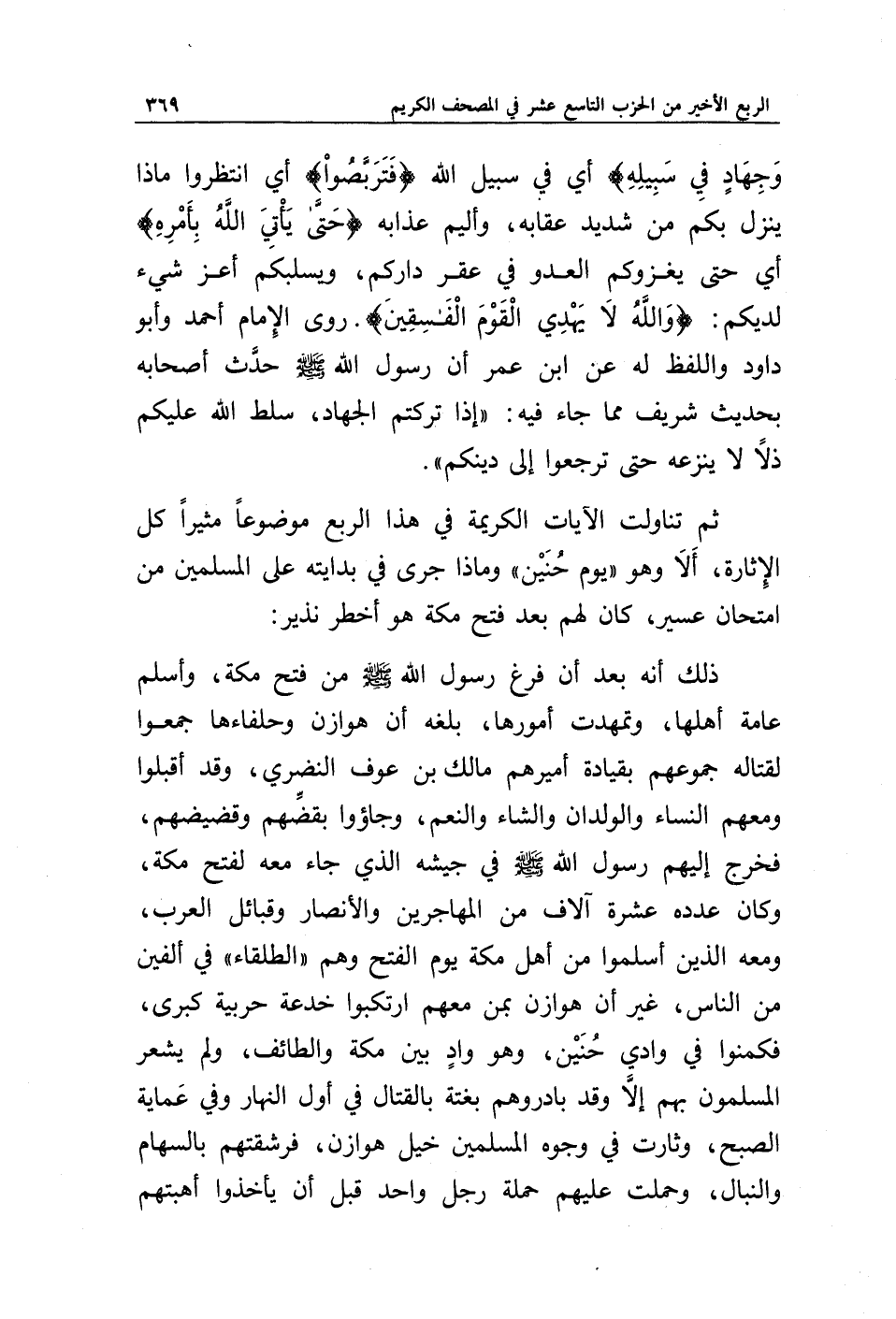 ثم تناولت الآيات الكريمة في هذا الربع موضوعا مثيرا كل الإثارة، ألا وهو " يوم حنين " وماذا جرى في بدايته على المسلمين من امتحان عسير، كان لهم بعد فتح مكة هو أخطر نذير: