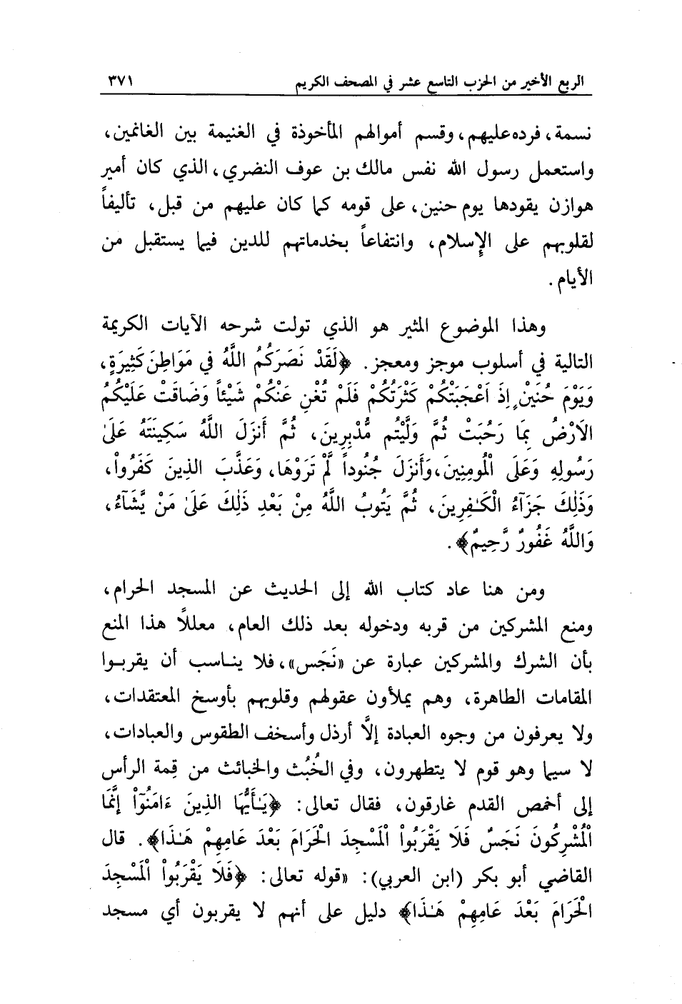 ومن هنا عاد كتاب الله إلى الحديث عن المسجد الحرام، ومنع المشركين من قربه ودخوله بعد ذلك العام، معللا هذا المنع بأن الشرك والمشركين عبارة عن {نَجَسٌ} فلا يناسب أن يقربوا المقامات الطاهرة، وهم يملأون عقولهم وقلوبهم بأوسخ المعتقدات، ولا يعرفون من وجوه العبادة إلا أرذل وأسخف الطقوس والعبادات، لا سيما وهم قوما لا يتطهرون، وفي الخبث والخبائث من قمة الرأس إلى أخمص القدم غارقون، فقال تعالى: {يَا أَيُّهَا الَّذِينَ آمَنُوا إِنَّمَا الْمُشْرِكُونَ نَجَسٌ فَلَا يَقْرَبُوا الْمَسْجِدَ الْحَرَامَ بَعْدَ عَامِهِمْ هَذَا}. قال القاضي أبو بكر (ابن العربي): " قوله تعالى: {فَلَا يَقْرَبُوا الْمَسْجِدَ الْحَرَامَ بَعْدَ عَامِهِمْ هَذَا} دليل على أنهم لا يقربون أي مسجد