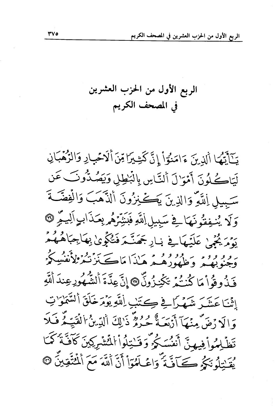 يَا أَيُّهَا الَّذِينَ آمَنُوا إِنَّ كَثِيرًا مِنَ الْأَحْبَارِ وَالرُّهْبَانِ لَيَأْكُلُونَ أَمْوَالَ النَّاسِ بِالْبَاطِلِ وَيَصُدُّونَ عَنْ سَبِيلِ اللَّهِ وَالَّذِينَ يَكْنِزُونَ الذَّهَبَ وَالْفِضَّةَ وَلَا يُنْفِقُونَهَا فِي سَبِيلِ اللَّهِ فَبَشِّرْهُمْ بِعَذَابٍ أَلِيمٍ (34) يَوْمَ يُحْمَى عَلَيْهَا فِي نَارِ جَهَنَّمَ فَتُكْوَى بِهَا جِبَاهُهُمْ وَجُنُوبُهُمْ وَظُهُورُهُمْ هَذَا مَا كَنَزْتُمْ لِأَنْفُسِكُمْ فَذُوقُوا مَا كُنْتُمْ تَكْنِزُونَ (35) إِنَّ عِدَّةَ الشُّهُورِ عِنْدَ اللَّهِ اثْنَا عَشَرَ شَهْرًا فِي كِتَابِ اللَّهِ يَوْمَ خَلَقَ السَّمَاوَاتِ وَالْأَرْضَ مِنْهَا أَرْبَعَةٌ حُرُمٌ ذَلِكَ الدِّينُ الْقَيِّمُ فَلَا تَظْلِمُوا فِيهِنَّ أَنْفُسَكُمْ وَقَاتِلُوا الْمُشْرِكِينَ كَافَّةً كَمَا يُقَاتِلُونَكُمْ كَافَّةً وَاعْلَمُوا أَنَّ اللَّهَ مَعَ الْمُتَّقِينَ (36)