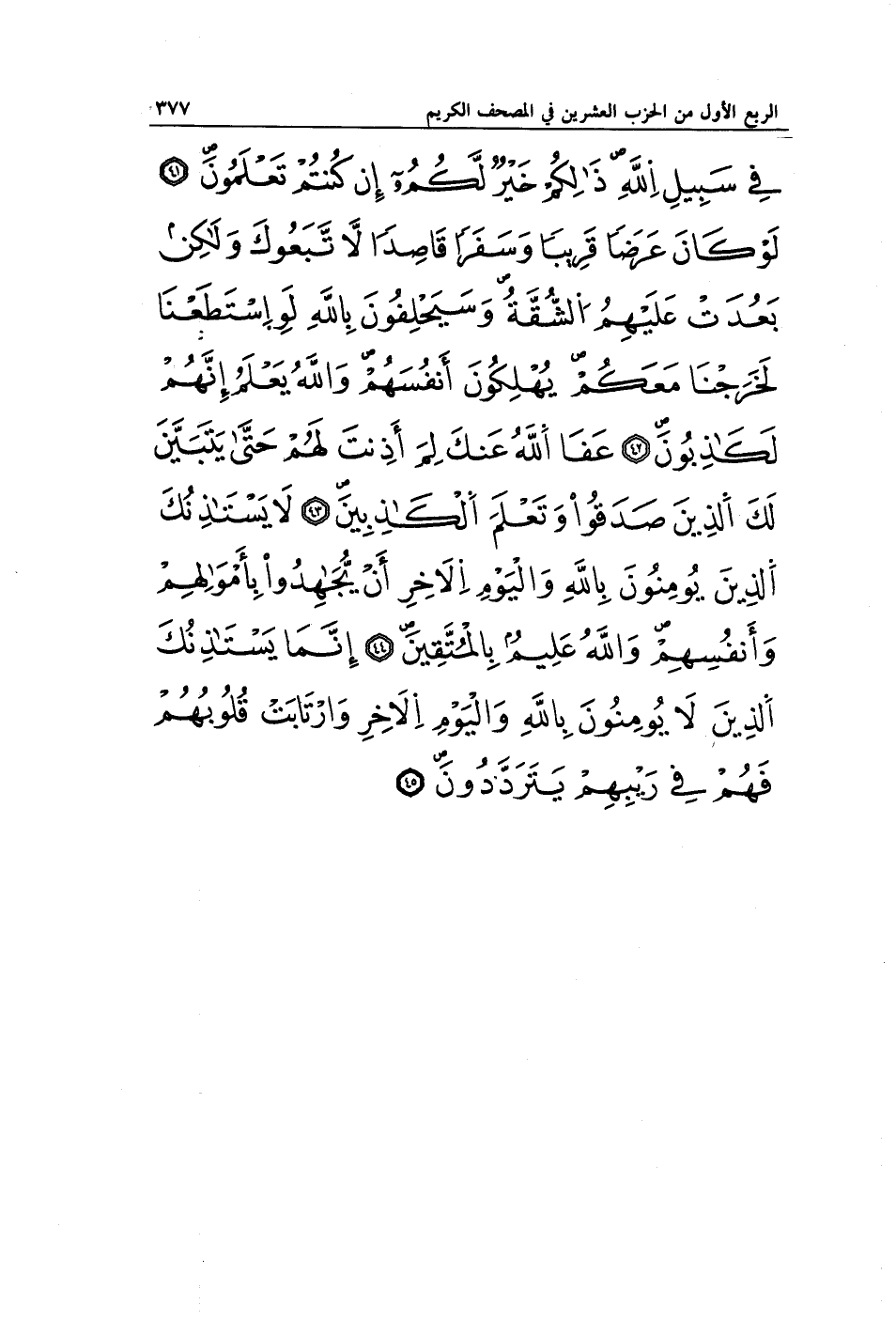 فِي سَبِيلِ اللَّهِ ذَلِكُمْ خَيْرٌ لَكُمْ إِنْ كُنْتُمْ تَعْلَمُونَ (41) لَوْ كَانَ عَرَضًا قَرِيبًا وَسَفَرًا قَاصِدًا لَاتَّبَعُوكَ وَلَكِنْ بَعُدَتْ عَلَيْهِمُ الشُّقَّةُ وَسَيَحْلِفُونَ بِاللَّهِ لَوِ اسْتَطَعْنَا لَخَرَجْنَا مَعَكُمْ يُهْلِكُونَ أَنْفُسَهُمْ وَاللَّهُ يَعْلَمُ إِنَّهُمْ لَكَاذِبُونَ (42) عَفَا اللَّهُ عَنْكَ لِمَ أَذِنْتَ لَهُمْ حَتَّى يَتَبَيَّنَ لَكَ الَّذِينَ صَدَقُوا وَتَعْلَمَ الْكَاذِبِينَ (43) لَا يَسْتَأْذِنُكَ الَّذِينَ يُؤْمِنُونَ بِاللَّهِ وَالْيَوْمِ الْآخِرِ أَنْ يُجَاهِدُوا بِأَمْوَالِهِمْ وَأَنْفُسِهِمْ وَاللَّهُ عَلِيمٌ بِالْمُتَّقِينَ (44) إِنَّمَا يَسْتَأْذِنُكَ الَّذِينَ لَا يُؤْمِنُونَ بِاللَّهِ وَالْيَوْمِ الْآخِرِ وَارْتَابَتْ قُلُوبُهُمْ فَهُمْ فِي رَيْبِهِمْ يَتَرَدَّدُونَ (45)