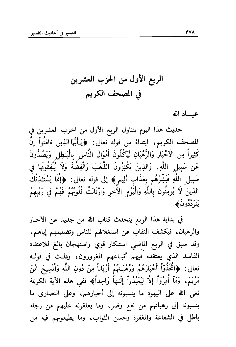 حديث هذا اليوم يتناول الربع الأول من الحزب العشرين في المصحف الكريم، ابتداء من قوله تعالى: {يَا أَيُّهَا الَّذِينَ آمَنُوا إِنَّ كَثِيرًا مِنَ الْأَحْبَارِ وَالرُّهْبَانِ لَيَأْكُلُونَ أَمْوَالَ النَّاسِ بِالْبَاطِلِ وَيَصُدُّونَ عَنْ سَبِيلِ اللَّهِ وَالَّذِينَ يَكْنِزُونَ الذَّهَبَ وَالْفِضَّةَ وَلَا يُنْفِقُونَهَا فِي سَبِيلِ اللَّهِ فَبَشِّرْهُمْ بِعَذَابٍ أَلِيمٍ} إلى قوله تعالى: {إِنَّمَا يَسْتَأْذِنُكَ الَّذِينَ لَا يُؤْمِنُونَ بِاللَّهِ وَالْيَوْمِ الْآخِرِ وَارْتَابَتْ قُلُوبُهُمْ فَهُمْ فِي رَيْبِهِمْ يَتَرَدَّدُونَ}.