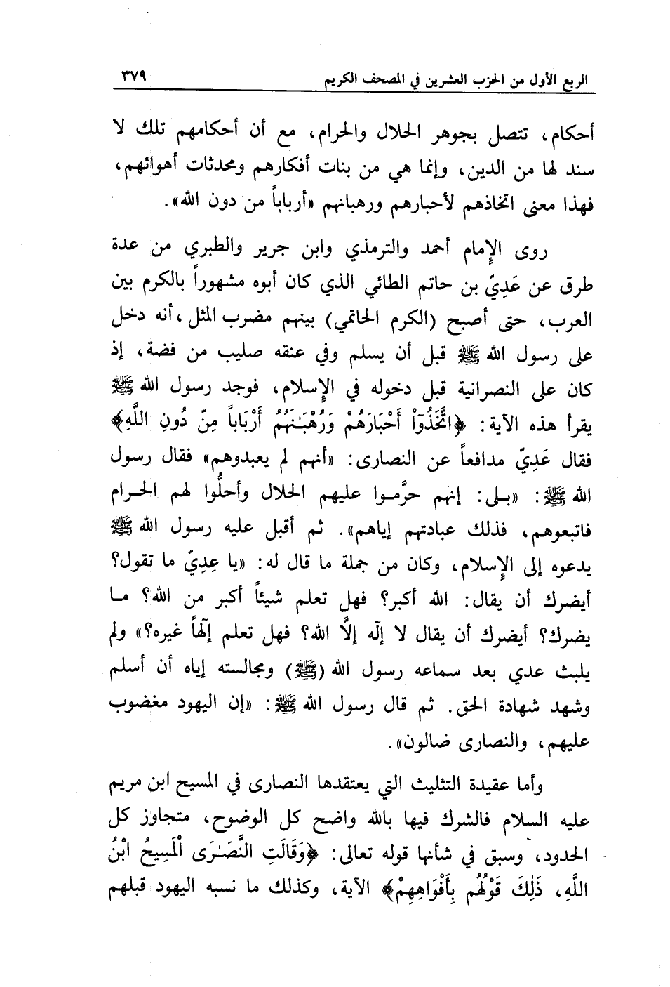 روى الإمام أحمد والترمذي وابن جرير والطبري من عدة طرق عن عدي بن حاتم الطائي الذي كان أبوه مشهورا بالكرم بين العرب، حتى أصبح " الكرم الحاتمي " بينهم مضرب المثل، أنه دخل على رسول الله صلى الله عليه وسلم قبل أن يسلم وفي عنقه صليب من فضة، إذ كان على النصرانية قبل دخوله في الإسلام، فوجد رسول الله صلى الله عليه وسلم يقرأ هذه الآية: {اتَّخَذُوا أَحْبَارَهُمْ وَرُهْبَانَهُمْ أَرْبَابًا مِنْ دُونِ اللَّهِ} فقال عدي مدافعا عن النصارى: " أنهم لم يعبدوهم " فقال رسول الله صلى الله عليه وسلم: (بلى إنهم حرموا عليهم الحلال وأحلوا الحرام فاتبعوهم، فذلك عبادتهم إياهم). ثم أقبل عليه رسول الله صلى الله عليه وسلم يدعوه إلى الإسلام، وكان من جملة ما قال له: (يا عدي ما تقول؟ أيضرك أن يقال: الله أكبر؟ فهل تعلم شيئا أكبر من الله؟ ما يضرك؟ أيضرك أن يقال لا إله إلا الله؟ فهل تعلم إلها غيره؟) ولم يلبث عدي بعد سماعه لرسول الله صلى الله عليه وسلم ومجالسته إياه أن أسلم وشهد شهادة الحق. ثم قال رسول الله صلى الله عليه وسلم: (إن اليهود مغضوب عليهم، والنصارى ضالون).