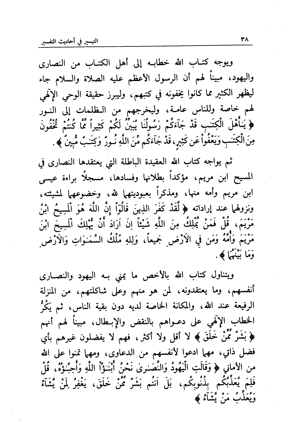 ويوجه كتاب الله خطابه إلى أهل الكتاب من النصارى واليهود، مبينا لهم أن الرسول الأعظم عليه الصلاة والسلام جاء ليظهر الكثير مما كانوا يخفونه في كتبهم، وليبرز حقيقة الوحي الإلهي لهم خاصة وللناس عامة، وليخرجهم من الظلمات إلى النور {يَا أَهْلَ الْكِتَابِ قَدْ جَاءَكُمْ رَسُولُنَا يُبَيِّنُ لَكُمْ كَثِيرًا مِمَّا كُنْتُمْ تُخْفُونَ مِنَ الْكِتَابِ وَيَعْفُو عَنْ كَثِيرٍ قَدْ جَاءَكُمْ مِنَ اللَّهِ نُورٌ وَكِتَابٌ مُبِينٌ}.
