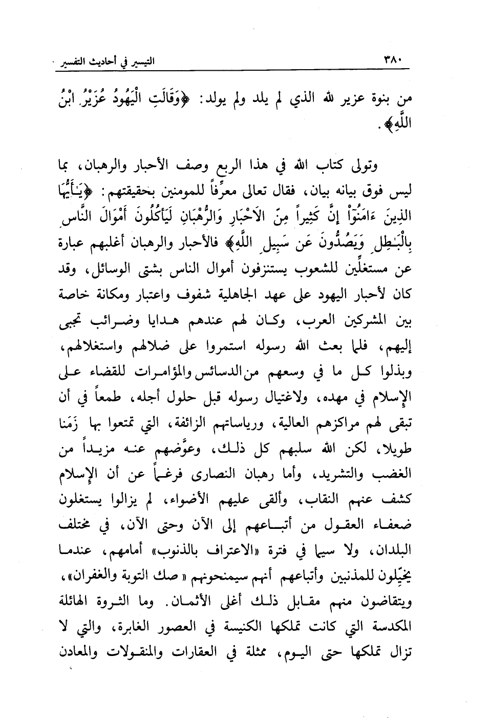 وتولى كتاب الله في هذا الربع وصف الأحبار والرهبان، بما ليس فوق بيانه بيان، فقال تعالى معرفا للمؤمنين بحقيقتهم: {يَا أَيُّهَا الَّذِينَ آمَنُوا إِنَّ كَثِيرًا مِنَ الْأَحْبَارِ وَالرُّهْبَانِ لَيَأْكُلُونَ أَمْوَالَ النَّاسِ بِالْبَاطِلِ وَيَصُدُّونَ عَنْ سَبِيلِ اللَّهِ} فالأحبار والرهبان أغلبهم عبارة عن مستغلين للشعوب يستنزفون أموال الناس بشتى الوسائل، وقد كان لأحبار اليهود على عهد الجاهلية شفوف واعتبار ومكانة خاصة بين المشركين العرب، وكان لهم عندهم هدايا وضرائب تجبي إليهم، فلما بعث الله رسوله صلى الله عليه وسلم استمروا على ضلالهم واستغلالهم، وبذلوا كل ما في وسعهم من الدسائس والمؤامرات للقضاء على الإسلام في مهده، ولاغتيال رسوله قبل حلول أجله، طمعا في أن تبقى لهم مراكزهم العالية، ورياساتهم الزائفة، التي تمتعوا بها زمنا طويلا، لكن الله سلبهم كل ذلك، وعوضهم عنه مزيدا من الغضب والتشريد، وأما رهبان النصارى فرغما عن أن الإسلام كشف عنهم النقاب، وألقى عليهم الأضواء، لم يزالوا يستغلون ضعفاء العقول من أتباعهم إلى الآن وحتى الآن، في مختلف البلدان، ولا سيما في فترة " الاعتراف بالذنوب " أمامهم، عندما يخيلون للمذنبين وأتباعهم أنهم سيمنحونهم " صك التوبة والغفران "، ويتقاضون منهم مقابل ذلك أغلى الأثمان. وما الثروة الهائلة المكدسة التي كانت تملكها الكنيسة في العصور الغابرة، والتي لا تزال تملكها حتى اليوم، ممثلة في العقارات والمنقولات والمعادن