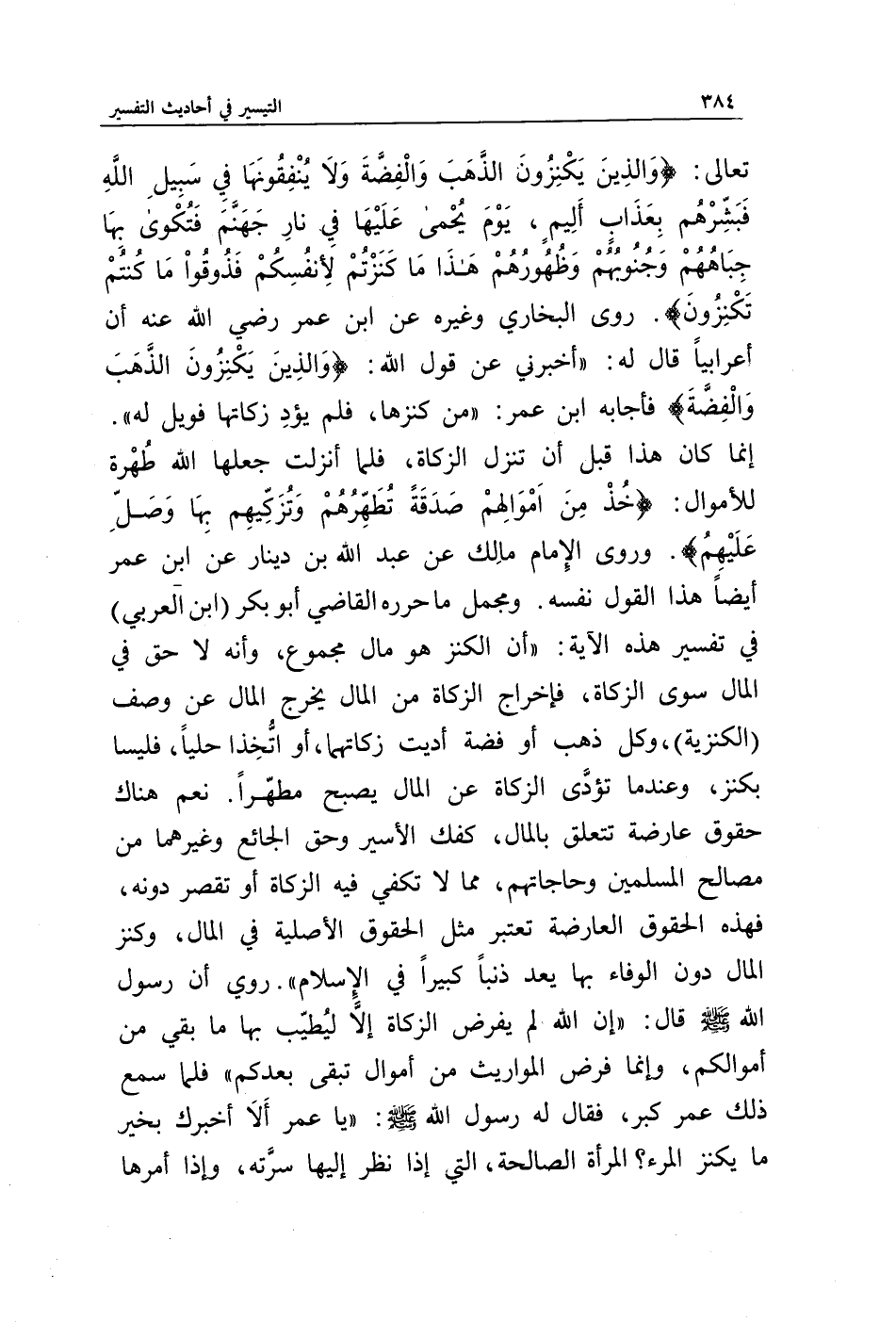 تعالى: {وَالَّذِينَ يَكْنِزُونَ الذَّهَبَ وَالْفِضَّةَ وَلَا يُنْفِقُونَهَا فِي سَبِيلِ اللَّهِ فَبَشِّرْهُمْ بِعَذَابٍ أَلِيمٍ * يَوْمَ يُحْمَى عَلَيْهَا فِي نَارِ جَهَنَّمَ فَتُكْوَى بِهَا جِبَاهُهُمْ وَجُنُوبُهُمْ وَظُهُورُهُمْ هَذَا مَا كَنَزْتُمْ لِأَنْفُسِكُمْ فَذُوقُوا مَا كُنْتُمْ تَكْنِزُونَ} روى البخاري وغيره عن ابن عمر رضي الله عنه أن أعرابيا قال له: " أخبرني عن قول الله: {وَالَّذِينَ يَكْنِزُونَ الذَّهَبَ وَالْفِضَّةَ} فأجابه ابن عمر: " من كنزها، فلم يؤد زكاتها فويل له ". إنما كان هذا قبل أن تنزل الزكاة، فلما أنزلت جعلها الله طهرة للأموال: {خُذْ مِنْ أَمْوَالِهِمْ صَدَقَةً تُطَهِّرُهُمْ وَتُزَكِّيهِمْ بِهَا وَصَلِّ عَلَيْهِمْ}. وروى الإمام مالك عن عبد الله بن دينار عن ابن عمر أيضا هذا القول نفسه. ومجمل ما حرره القاضي أبو بكر " ابن العربي " في تفسير هذه الآية: " أن الكنز هو مال مجموع، وأنه لا حق في المال سوى الزكاة، فإخراج الزكاة من المال يخرج المال عن وصف " الكنزية "، وكل ذهب أو فضة أديت زكاتهما، أو اتخذا حليا، فليسا بكنز وعندما تؤدى الزكاة عن المال يصبح مطهرا. نعم هناك حقوق عارضة تتعلق بالمال، كفك الأسير وحق الجائع وغيرهما من مصالح المسلمين وحاجاتهم، مما لا تكفي فيه الزكاة أو تقصر دونه، فهذه الحقوق العارضة تعتبر مثل الحقوق الأصلية في المال، وكنز المال دون الوفاء بها يعد ذنبا كبيرا في الإسلام ". روي أن رسول الله صلى الله عليه وسلم قال: (إن الله لم يفرض الزكاة إلا ليطيب بها ما بقي من أموالكم، وإنما فرض المواريث من أموال تبقى بعدكم) فلما سمع ذلك عمر كبر، فقال له رسول الله صلى الله عليه وسلم: (يا عمر ألا أخبرك بخير ما يكنز المرء؟ المرأة الصالحة، التي إذا نظر إليها سرته، وإذا أمرها