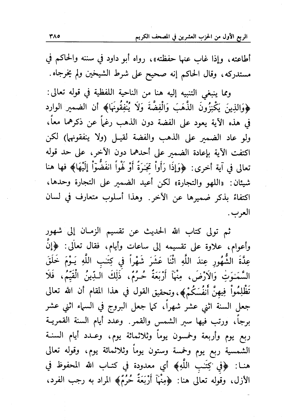 ثم تولى كتاب الله الحديث عن تقسيم الزمان إلى شهور وأعوام، علاوة على تقسيمه إلى ساعات وأيام، فقال تعالى: {إِنَّ عِدَّةَ الشُّهُورِ عِنْدَ اللَّهِ اثْنَا عَشَرَ شَهْرًا فِي كِتَابِ اللَّهِ يَوْمَ خَلَقَ السَّمَاوَاتِ وَالْأَرْضَ مِنْهَا أَرْبَعَةٌ حُرُمٌ ذَلِكَ الدِّينُ الْقَيِّمُ فَلَا تَظْلِمُوا فِيهِنَّ أَنْفُسَكُمْ}، وتحقيق القول في هذا المقام أن الله تعالى جعل السنة اثني عشر شهرا، كما جعل البروج في السماء اثني عشر برجا، ورتب فيها سير الشمس والقمر. وعدد أيام السنة القمرية ربع يوم وأربعة وخمسون يوما وثلاثمائة يوم، وقوله تعالى هنا: {فِي كِتَابِ اللَّهِ} أي معدودة في كتاب الله المحفوظ في الأزل، وقوله تعالى هنا: {مِنْهَا أَرْبَعَةٌ حُرُمٌ} المراد به رجب الفرد،