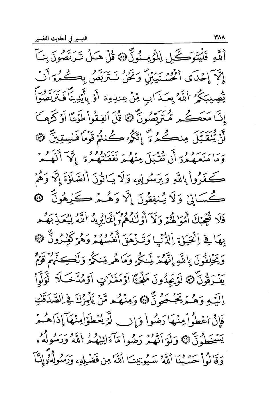 اللَّهِ فَلْيَتَوَكَّلِ الْمُؤْمِنُونَ (51) قُلْ هَلْ تَرَبَّصُونَ بِنَا إِلَّا إِحْدَى الْحُسْنَيَيْنِ وَنَحْنُ نَتَرَبَّصُ بِكُمْ أَنْ يُصِيبَكُمُ اللَّهُ بِعَذَابٍ مِنْ عِنْدِهِ أَوْ بِأَيْدِينَا فَتَرَبَّصُوا إِنَّا مَعَكُمْ مُتَرَبِّصُونَ (52) قُلْ أَنْفِقُوا طَوْعًا أَوْ كَرْهًا لَنْ يُتَقَبَّلَ مِنْكُمْ إِنَّكُمْ كُنْتُمْ قَوْمًا فَاسِقِينَ (53) وَمَا مَنَعَهُمْ أَنْ تُقْبَلَ مِنْهُمْ نَفَقَاتُهُمْ إِلَّا أَنَّهُمْ كَفَرُوا بِاللَّهِ وَبِرَسُولِهِ وَلَا يَأْتُونَ الصَّلَاةَ إِلَّا وَهُمْ كُسَالَى وَلَا يُنْفِقُونَ إِلَّا وَهُمْ كَارِهُونَ (54) فَلَا تُعْجِبْكَ أَمْوَالُهُمْ وَلَا أَوْلَادُهُمْ إِنَّمَا يُرِيدُ اللَّهُ لِيُعَذِّبَهُمْ بِهَا فِي الْحَيَاةِ الدُّنْيَا وَتَزْهَقَ أَنْفُسُهُمْ وَهُمْ كَافِرُونَ (55) وَيَحْلِفُونَ بِاللَّهِ إِنَّهُمْ لَمِنْكُمْ وَمَا هُمْ مِنْكُمْ وَلَكِنَّهُمْ قَوْمٌ يَفْرَقُونَ (56) لَوْ يَجِدُونَ مَلْجَأً أَوْ مَغَارَاتٍ أَوْ مُدَّخَلًا لَوَلَّوْا إِلَيْهِ وَهُمْ يَجْمَحُونَ (57) وَمِنْهُمْ مَنْ يَلْمِزُكَ فِي الصَّدَقَاتِ فَإِنْ أُعْطُوا مِنْهَا رَضُوا وَإِنْ لَمْ يُعْطَوْا مِنْهَا إِذَا هُمْ يَسْخَطُونَ (58) وَلَوْ أَنَّهُمْ رَضُوا مَا آتَاهُمُ اللَّهُ وَرَسُولُهُ وَقَالُوا حَسْبُنَا اللَّهُ سَيُؤْتِينَا اللَّهُ مِنْ فَضْلِهِ وَرَسُولُهُ إِنَّا