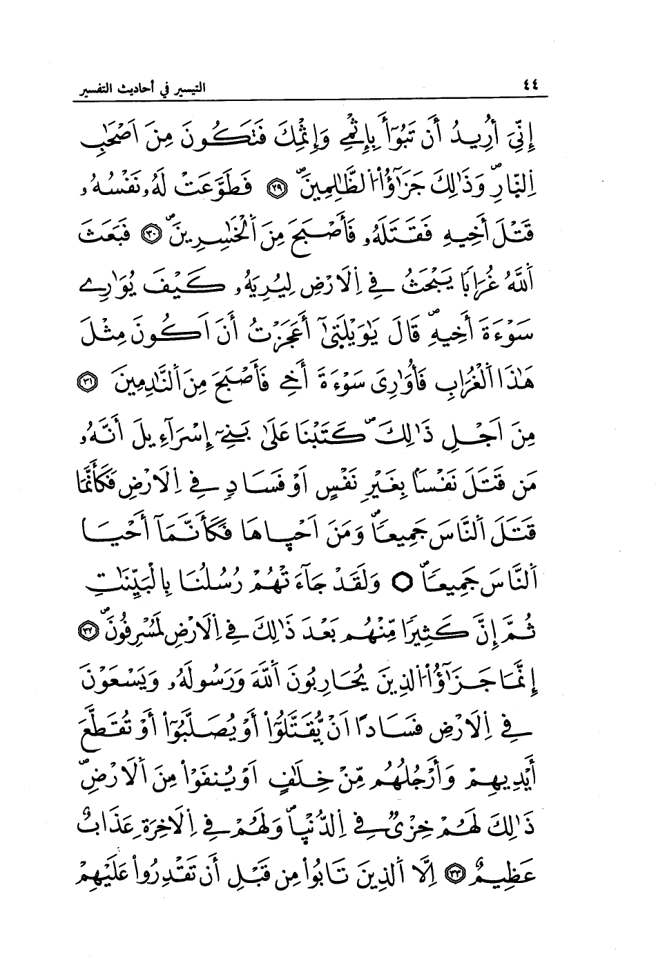 إِنِّي أُرِيدُ أَنْ تَبُوءَ بِإِثْمِي وَإِثْمِكَ فَتَكُونَ مِنْ أَصْحَابِ النَّارِ وَذَلِكَ جَزَاءُ الظَّالِمِينَ (29) فَطَوَّعَتْ لَهُ نَفْسُهُ قَتْلَ أَخِيهِ فَقَتَلَهُ فَأَصْبَحَ مِنَ الْخَاسِرِينَ (30) فَبَعَثَ اللَّهُ غُرَابًا يَبْحَثُ فِي الْأَرْضِ لِيُرِيَهُ كَيْفَ يُوَارِي سَوْءَةَ أَخِيهِ قَالَ يَا وَيْلَتَا أَعَجَزْتُ أَنْ أَكُونَ مِثْلَ هَذَا الْغُرَابِ فَأُوَارِيَ سَوْءَةَ أَخِي فَأَصْبَحَ مِنَ النَّادِمِينَ (31) مِنْ أَجْلِ ذَلِكَ كَتَبْنَا عَلَى بَنِي إِسْرَائِيلَ أَنَّهُ مَنْ قَتَلَ نَفْسًا بِغَيْرِ نَفْسٍ أَوْ فَسَادٍ فِي الْأَرْضِ فَكَأَنَّمَا قَتَلَ النَّاسَ جَمِيعًا وَمَنْ أَحْيَاهَا فَكَأَنَّمَا أَحْيَا النَّاسَ جَمِيعًا وَلَقَدْ جَاءَتْهُمْ رُسُلُنَا بِالْبَيِّنَاتِ ثُمَّ إِنَّ كَثِيرًا مِنْهُمْ بَعْدَ ذَلِكَ فِي الْأَرْضِ لَمُسْرِفُونَ (32) إِنَّمَا جَزَاءُ الَّذِينَ يُحَارِبُونَ اللَّهَ وَرَسُولَهُ وَيَسْعَوْنَ فِي الْأَرْضِ فَسَادًا أَنْ يُقَتَّلُوا أَوْ يُصَلَّبُوا أَوْ تُقَطَّعَ أَيْدِيهِمْ وَأَرْجُلُهُمْ مِنْ خِلَافٍ أَوْ يُنْفَوْا مِنَ الْأَرْضِ ذَلِكَ لَهُمْ خِزْيٌ فِي الدُّنْيَا وَلَهُمْ فِي الْآخِرَةِ عَذَابٌ عَظِيمٌ (33) إِلَّا الَّذِينَ تَابُوا مِنْ قَبْلِ أَنْ تَقْدِرُوا عَلَيْهِمْ