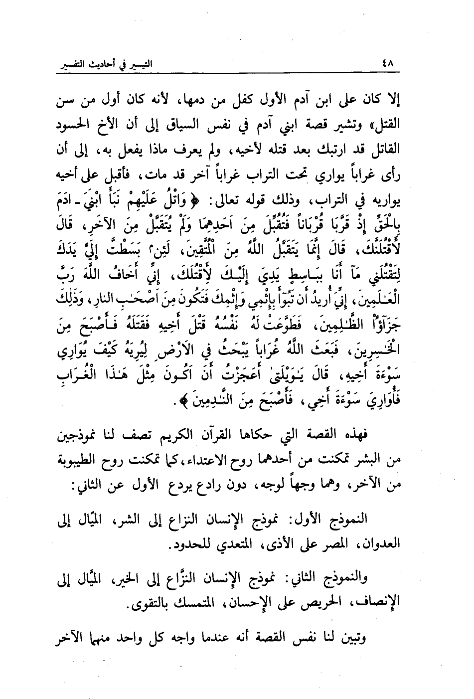 فهذه القصة التي حكاها القرآن الكريم تصف لنا نموذجين من البشر تمكنت من أحدهما روح الاعتداء، كما تمكنت روح الطيبوبة من الآخر، وهما وجها لوجه، دون رادع يردع الأول من الثاني: