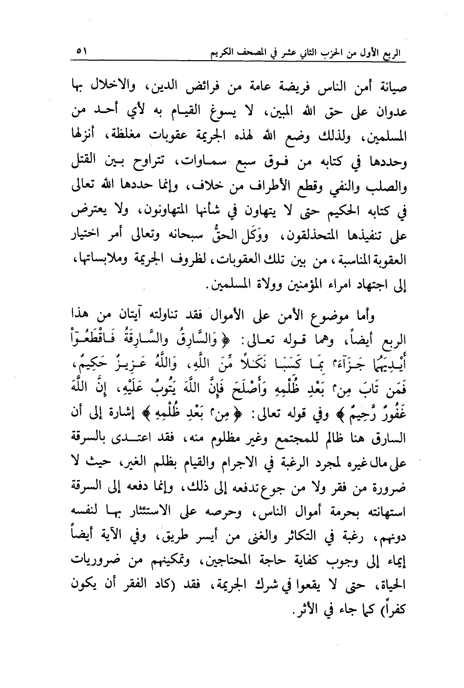 وأما موضوع الأمن على الأموال فقد تناولته آيتان من هذا الربع أيضا، وهما قوله تعالى: {وَالسَّارِقُ وَالسَّارِقَةُ فَاقْطَعُوا أَيْدِيَهُمَا جَزَاءً بِمَا كَسَبَا نَكَالًا مِنَ اللَّهِ وَاللَّهُ عَزِيزٌ حَكِيمٌ * فَمَنْ تَابَ مِنْ بَعْدِ ظُلْمِهِ وَأَصْلَحَ فَإِنَّ اللَّهَ يَتُوبُ عَلَيْهِ إِنَّ اللَّهَ غَفُورٌ رَحِيمٌ} وفي قوله تعالى: {مِنْ بَعْدِ ظُلْمِهِ} إشارة إلى أن السارق هنا ظالم للمجتمع وغير مظلوم منه، فقد اعتدى بالسرقة على مال غيره لمجرد الرغبة في الإجرام والقيام بظلم الغير، حيث لا ضرورة من فقر ولا جوع تدفعه إلى ذلك، وإنما دفعه إلى السرقة استهانته بحرمة أموال الناس، وحرصه على الاستئثار بها لنفسه دونهم، رغبة في التكاثر والغنى من أيسر طريق، وفي الآية أيضا إيماء إلى وجوب كفاية حاجة المحتجين، وتمكينهم من ضروريات الحياة، حتى لا يقعوا في شرك الجريمة، فقد (كاد الفقر أن يكون كفرا) كما جاء في الأثر.