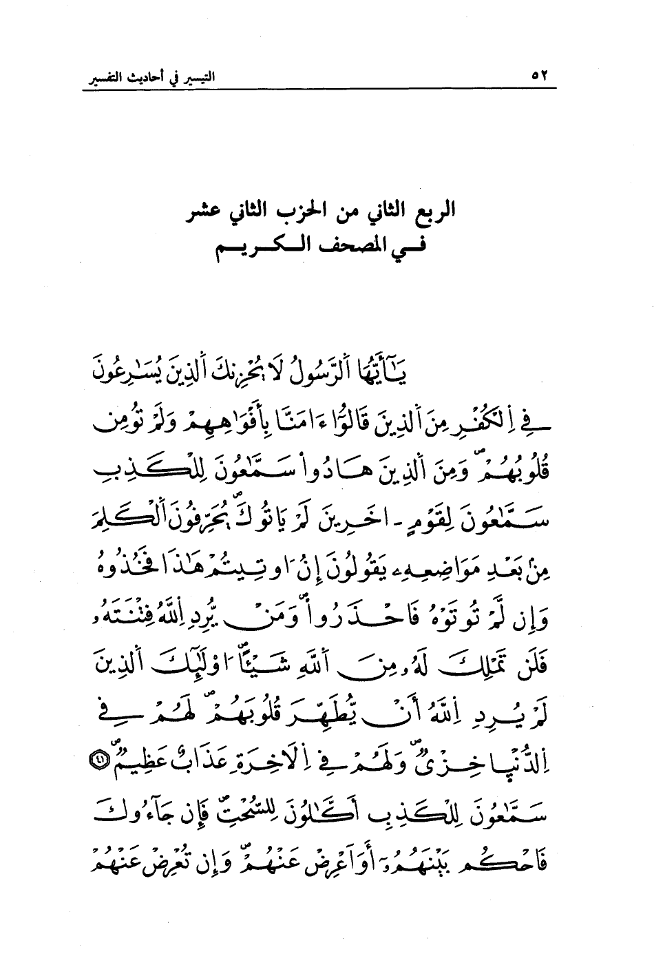 يَا أَيُّهَا الرَّسُولُ لَا يَحْزُنْكَ الَّذِينَ يُسَارِعُونَ فِي الْكُفْرِ مِنَ الَّذِينَ قَالُوا آمَنَّا بِأَفْوَاهِهِمْ وَلَمْ تُؤْمِنْ قُلُوبُهُمْ وَمِنَ الَّذِينَ هَادُوا سَمَّاعُونَ لِلْكَذِبِ سَمَّاعُونَ لِقَوْمٍ آخَرِينَ لَمْ يَأْتُوكَ يُحَرِّفُونَ الْكَلِمَ مِنْ بَعْدِ مَوَاضِعِهِ يَقُولُونَ إِنْ أُوتِيتُمْ هَذَا فَخُذُوهُ وَإِنْ لَمْ تُؤْتَوْهُ فَاحْذَرُوا وَمَنْ يُرِدِ اللَّهُ فِتْنَتَهُ فَلَنْ تَمْلِكَ لَهُ مِنَ اللَّهِ شَيْئًا أُولَئِكَ الَّذِينَ لَمْ يُرِدِ اللَّهُ أَنْ يُطَهِّرَ قُلُوبَهُمْ لَهُمْ فِي الدُّنْيَا خِزْيٌ وَلَهُمْ فِي الْآخِرَةِ عَذَابٌ عَظِيمٌ (41) سَمَّاعُونَ لِلْكَذِبِ أَكَّالُونَ لِلسُّحْتِ فَإِنْ جَاءُوكَ فَاحْكُمْ بَيْنَهُمْ أَوْ أَعْرِضْ عَنْهُمْ وَإِنْ تُعْرِضْ عَنْهُمْ