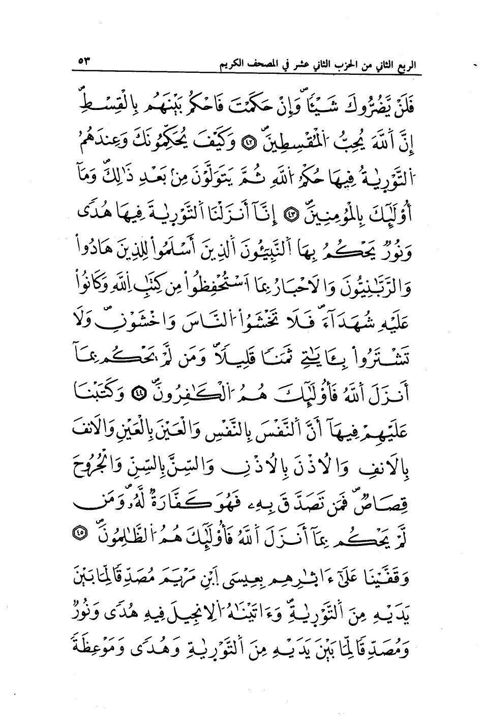 فَلَنْ يَضُرُّوكَ شَيْئًا وَإِنْ حَكَمْتَ فَاحْكُمْ بَيْنَهُمْ بِالْقِسْطِ إِنَّ اللَّهَ يُحِبُّ الْمُقْسِطِينَ (42) وَكَيْفَ يُحَكِّمُونَكَ وَعِنْدَهُمُ التَّوْرَاةُ فِيهَا حُكْمُ اللَّهِ ثُمَّ يَتَوَلَّوْنَ مِنْ بَعْدِ ذَلِكَ وَمَا أُولَئِكَ بِالْمُؤْمِنِينَ (43) إِنَّا أَنْزَلْنَا التَّوْرَاةَ فِيهَا هُدًى وَنُورٌ يَحْكُمُ بِهَا النَّبِيُّونَ الَّذِينَ أَسْلَمُوا لِلَّذِينَ هَادُوا وَالرَّبَّانِيُّونَ وَالْأَحْبَارُ بِمَا اسْتُحْفِظُوا مِنْ كِتَابِ اللَّهِ وَكَانُوا عَلَيْهِ شُهَدَاءَ فَلَا تَخْشَوُا النَّاسَ وَاخْشَوْنِ وَلَا تَشْتَرُوا بِآيَاتِي ثَمَنًا قَلِيلًا وَمَنْ لَمْ يَحْكُمْ بِمَا أَنْزَلَ اللَّهُ فَأُولَئِكَ هُمُ الْكَافِرُونَ (44) وَكَتَبْنَا عَلَيْهِمْ فِيهَا أَنَّ النَّفْسَ بِالنَّفْسِ وَالْعَيْنَ بِالْعَيْنِ وَالْأَنْفَ بِالْأَنْفِ وَالْأُذُنَ بِالْأُذُنِ وَالسِّنَّ بِالسِّنِّ وَالْجُرُوحَ قِصَاصٌ فَمَنْ تَصَدَّقَ بِهِ فَهُوَ كَفَّارَةٌ لَهُ وَمَنْ لَمْ يَحْكُمْ بِمَا أَنْزَلَ اللَّهُ فَأُولَئِكَ هُمُ الظَّالِمُونَ (45) وَقَفَّيْنَا عَلَى آثَارِهِمْ بِعِيسَى ابْنِ مَرْيَمَ مُصَدِّقًا لِمَا بَيْنَ يَدَيْهِ مِنَ التَّوْرَاةِ وَآتَيْنَاهُ الْإِنْجِيلَ فِيهِ هُدًى وَنُورٌ وَمُصَدِّقًا لِمَا بَيْنَ يَدَيْهِ مِنَ التَّوْرَاةِ وَهُدًى وَمَوْعِظَةً