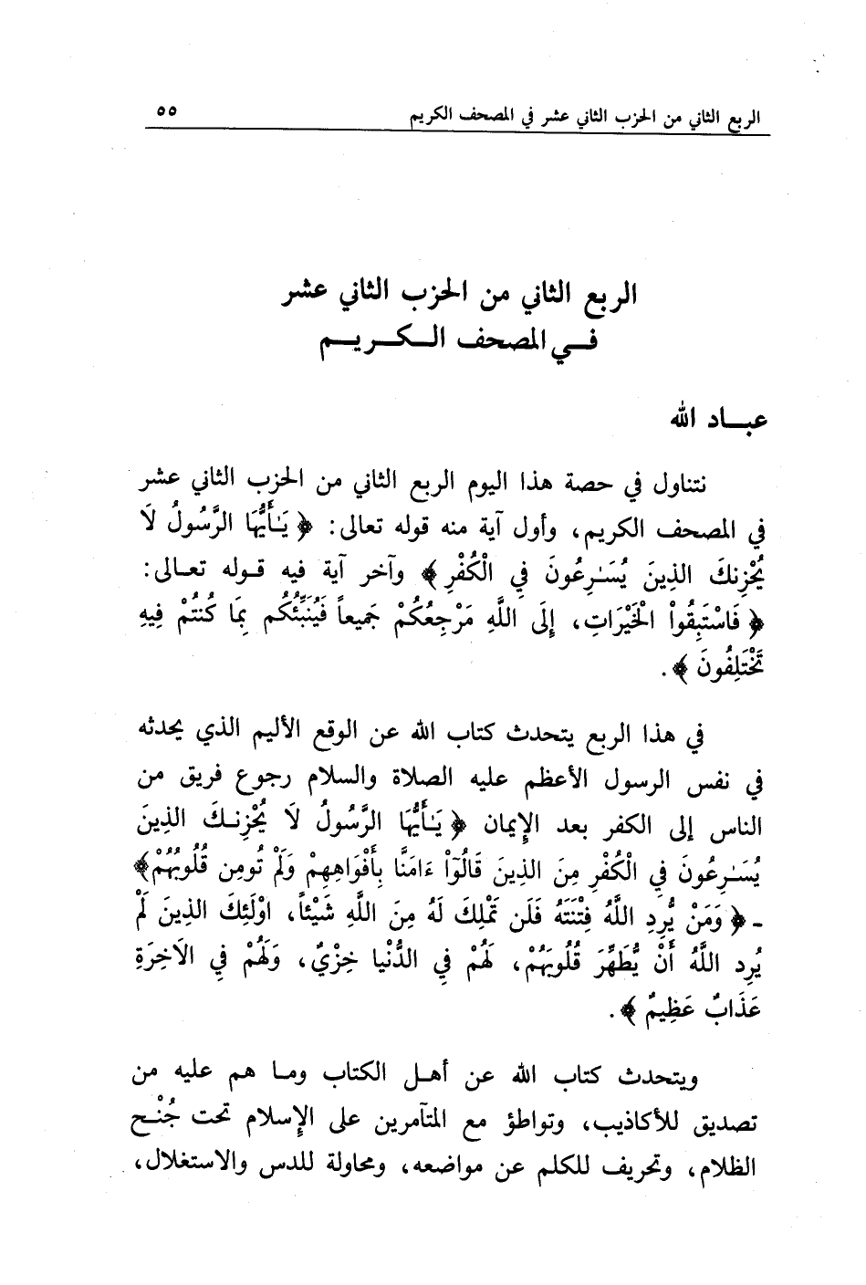 نتناول في حصة هذا اليوم الربع الثاني من الحزب الثاني عشر في المصحف الكريم، وأول آية منه قوله تعالى: {يَا أَيُّهَا الرَّسُولُ لَا يَحْزُنْكَ الَّذِينَ يُسَارِعُونَ فِي الْكُفْرِ} وآخر آية فيه قوله تعالى: {فَاسْتَبِقُوا الْخَيْرَاتِ إِلَى اللَّهِ مَرْجِعُكُمْ جَمِيعًا فَيُنَبِّئُكُمْ بِمَا كُنْتُمْ فِيهِ تَخْتَلِفُونَ}.