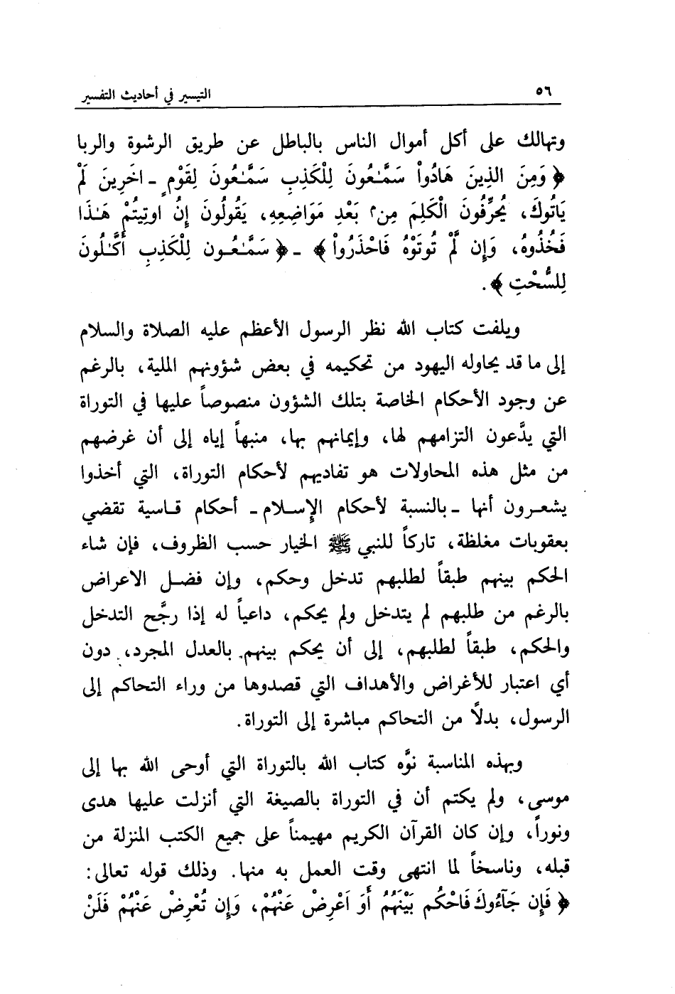 وبهذه المناسبة نوه كتاب الله بالتوراة التي أوحى الله بها إلى موسى، ولم يكتم أن في التوراة بالصيغة التي أنزلت عليها هدى ونورا، وإن كان القرآن الكريم مهيمنا على جميع الكتب المنزلة من قبله، وناسخا لما انتهى وقت العمل به منها. وذلك قوله تعالى: {فَإِنْ جَاءُوكَ فَاحْكُمْ بَيْنَهُمْ أَوْ أَعْرِضْ عَنْهُمْ وَإِنْ تُعْرِضْ عَنْهُمْ فَلَنْ