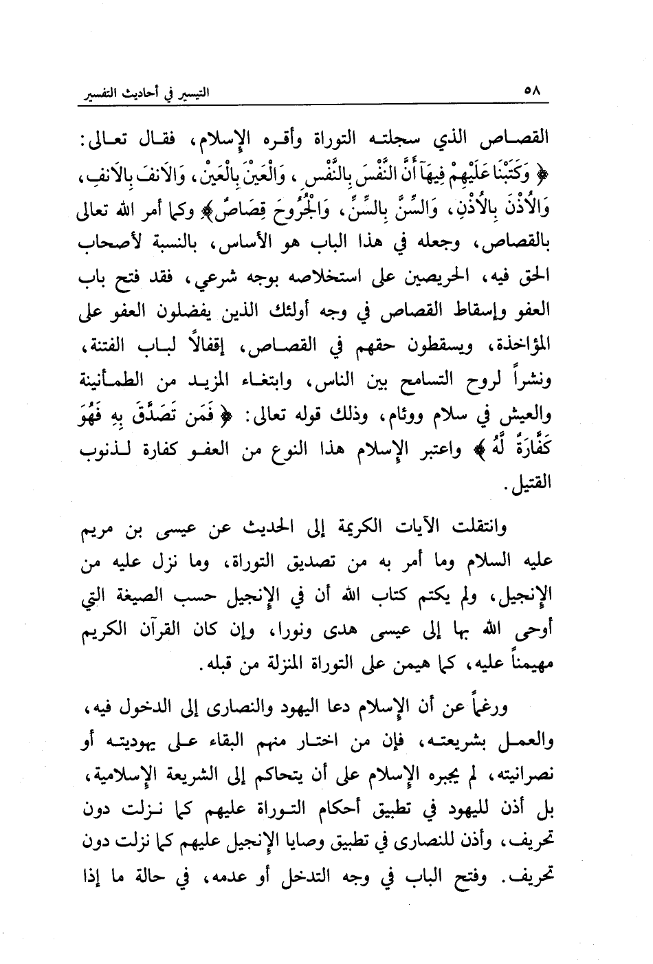 القصاص الذي سجلته التوراة وأقره الإسلام، فقال تعالى: {وَكَتَبْنَا عَلَيْهِمْ فِيهَا أَنَّ النَّفْسَ بِالنَّفْسِ وَالْعَيْنَ بِالْعَيْنِ وَالْأَنْفَ بِالْأَنْفِ وَالْأُذُنَ بِالْأُذُنِ وَالسِّنَّ بِالسِّنِّ وَالْجُرُوحَ قِصَاصٌ} وكما أمر الله تعالى بالقصاص، وجعله في هذا الباب هو الأساس، بالنسبة لأصحاب الحق فيه، الحريصين على استخلاصه بوجه شرعي، فقد فتح باب العفو وإسقاط القصاص في وجه أولئك الذين يفضلون العفو على المؤاخذة، ويسقطون حقهم في القصاص، إقفالا لباب الفتنة، ونشرا لروح التسامح بين الناس، وابتغاء المزيد من الطمأنينة والعيش في سلام ووئام، وذلك قوله تعالى: {فَمَنْ تَصَدَّقَ بِهِ فَهُوَ كَفَّارَةٌ لَهُ} واعتبر الإسلام هذا النوع من العفو كفارة لذنوب القتيل.