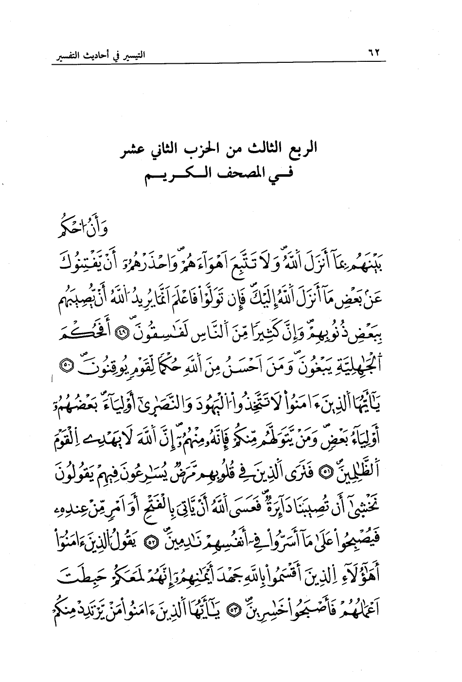 وَأَنِ احْكُمْ بَيْنَهُمْ بِمَا أَنْزَلَ اللَّهُ وَلَا تَتَّبِعْ أَهْوَاءَهُمْ وَاحْذَرْهُمْ أَنْ يَفْتِنُوكَ عَنْ بَعْضِ مَا أَنْزَلَ اللَّهُ إِلَيْكَ فَإِنْ تَوَلَّوْا فَاعْلَمْ أَنَّمَا يُرِيدُ اللَّهُ أَنْ يُصِيبَهُمْ بِبَعْضِ ذُنُوبِهِمْ وَإِنَّ كَثِيرًا مِنَ النَّاسِ لَفَاسِقُونَ (49) أَفَحُكْمَ الْجَاهِلِيَّةِ يَبْغُونَ وَمَنْ أَحْسَنُ مِنَ اللَّهِ حُكْمًا لِقَوْمٍ يُوقِنُونَ (50) يَا أَيُّهَا الَّذِينَ آمَنُوا لَا تَتَّخِذُوا الْيَهُودَ وَالنَّصَارَى أَوْلِيَاءَ بَعْضُهُمْ أَوْلِيَاءُ بَعْضٍ وَمَنْ يَتَوَلَّهُمْ مِنْكُمْ فَإِنَّهُ مِنْهُمْ إِنَّ اللَّهَ لَا يَهْدِي الْقَوْمَ الظَّالِمِينَ (51) فَتَرَى الَّذِينَ فِي قُلُوبِهِمْ مَرَضٌ يُسَارِعُونَ فِيهِمْ يَقُولُونَ نَخْشَى أَنْ تُصِيبَنَا دَائِرَةٌ فَعَسَى اللَّهُ أَنْ يَأْتِيَ بِالْفَتْحِ أَوْ أَمْرٍ مِنْ عِنْدِهِ فَيُصْبِحُوا عَلَى مَا أَسَرُّوا فِي أَنْفُسِهِمْ نَادِمِينَ (52) وَيَقُولُ الَّذِينَ آمَنُوا أَهَؤُلَاءِ الَّذِينَ أَقْسَمُوا بِاللَّهِ جَهْدَ أَيْمَانِهِمْ إِنَّهُمْ لَمَعَكُمْ حَبِطَتْ أَعْمَالُهُمْ فَأَصْبَحُوا خَاسِرِينَ (53) يَا أَيُّهَا الَّذِينَ آمَنُوا مَنْ يَرْتَدَّ مِنْكُمْ
