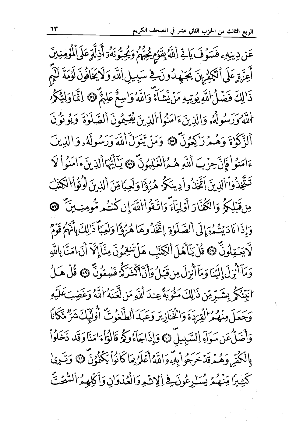 عَنْ دِينِهِ فَسَوْفَ يَأْتِي اللَّهُ بِقَوْمٍ يُحِبُّهُمْ وَيُحِبُّونَهُ أَذِلَّةٍ عَلَى الْمُؤْمِنِينَ أَعِزَّةٍ عَلَى الْكَافِرِينَ يُجَاهِدُونَ فِي سَبِيلِ اللَّهِ وَلَا يَخَافُونَ لَوْمَةَ لَائِمٍ ذَلِكَ فَضْلُ اللَّهِ يُؤْتِيهِ مَنْ يَشَاءُ وَاللَّهُ وَاسِعٌ عَلِيمٌ (54) إِنَّمَا وَلِيُّكُمُ اللَّهُ وَرَسُولُهُ وَالَّذِينَ آمَنُوا الَّذِينَ يُقِيمُونَ الصَّلَاةَ وَيُؤْتُونَ الزَّكَاةَ وَهُمْ رَاكِعُونَ (55) وَمَنْ يَتَوَلَّ اللَّهَ وَرَسُولَهُ وَالَّذِينَ آمَنُوا فَإِنَّ حِزْبَ اللَّهِ هُمُ الْغَالِبُونَ (56) يَا أَيُّهَا الَّذِينَ آمَنُوا لَا تَتَّخِذُوا الَّذِينَ اتَّخَذُوا دِينَكُمْ هُزُوًا وَلَعِبًا مِنَ الَّذِينَ أُوتُوا الْكِتَابَ مِنْ قَبْلِكُمْ وَالْكُفَّارَ أَوْلِيَاءَ وَاتَّقُوا اللَّهَ إِنْ كُنْتُمْ مُؤْمِنِينَ (57) وَإِذَا نَادَيْتُمْ إِلَى الصَّلَاةِ اتَّخَذُوهَا هُزُوًا وَلَعِبًا ذَلِكَ بِأَنَّهُمْ قَوْمٌ لَا يَعْقِلُونَ (58) قُلْ يَا أَهْلَ الْكِتَابِ هَلْ تَنْقِمُونَ مِنَّا إِلَّا أَنْ آمَنَّا بِاللَّهِ وَمَا أُنْزِلَ إِلَيْنَا وَمَا أُنْزِلَ مِنْ قَبْلُ وَأَنَّ أَكْثَرَكُمْ فَاسِقُونَ (59) قُلْ هَلْ أُنَبِّئُكُمْ بِشَرٍّ مِنْ ذَلِكَ مَثُوبَةً عِنْدَ اللَّهِ مَنْ لَعَنَهُ اللَّهُ وَغَضِبَ عَلَيْهِ وَجَعَلَ مِنْهُمُ الْقِرَدَةَ وَالْخَنَازِيرَ وَعَبَدَ الطَّاغُوتَ أُولَئِكَ شَرٌّ مَكَانًا وَأَضَلُّ عَنْ سَوَاءِ السَّبِيلِ (60) وَإِذَا جَاءُوكُمْ قَالُوا آمَنَّا وَقَدْ دَخَلُوا بِالْكُفْرِ وَهُمْ قَدْ خَرَجُوا بِهِ وَاللَّهُ أَعْلَمُ بِمَا كَانُوا يَكْتُمُونَ (61) وَتَرَى كَثِيرًا مِنْهُمْ يُسَارِعُونَ فِي الْإِثْمِ وَالْعُدْوَانِ وَأَكْلِهِمُ السُّحْتَ