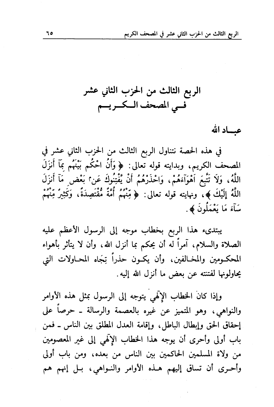 في هذه الحصة نتناول الربع الثالث من الحزب الثاني عشر في المصحف الكريم، وبدايته قوله تعالى: {وَأَنِ احْكُمْ بَيْنَهُمْ بِمَا أَنْزَلَ اللَّهُ وَلَا تَتَّبِعْ أَهْوَاءَهُمْ وَاحْذَرْهُمْ أَنْ يَفْتِنُوكَ عَنْ بَعْضِ مَا أَنْزَلَ اللَّهُ إِلَيْكَ} ونهايته قوله تعالى: {مِنْهُمْ أُمَّةٌ مُقْتَصِدَةٌ وَكَثِيرٌ مِنْهُمْ سَاءَ مَا يَعْمَلُونَ}.